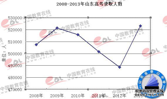 中国教育在线消息 2013年山东省普通高校招生共录取考生523242人(含春季高考录取38576人),录取率达到88.95%。根据数据显示,山东2008-2012年高考录取人数依次为507580人,521505人,515744人,501505人和488664人。