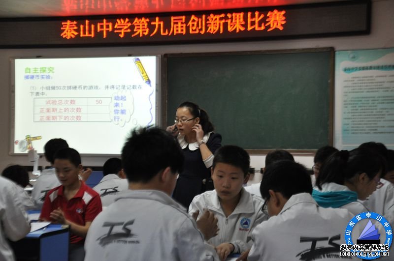 上午第二节季小翠老师进行的是《频率的稳定性》一节。当你看着一个个抛硬币、然后兴致盎然记录数据的学习场面,都会使你忘记这是多为沉闷枯燥的数学课。通过50次的硬币抛落,对正反面次数的记录与分析,学生在游戏中就把一个个枯燥的概念,如“常数”、“频率的稳定性”“概率”等熟记在心,学生们再做那些抽象的题目,手到擒来,很有成就感的嗷。季老师化枯燥为有趣的理念、深入浅出的教学手法让课堂变成了学生学习的乐园。