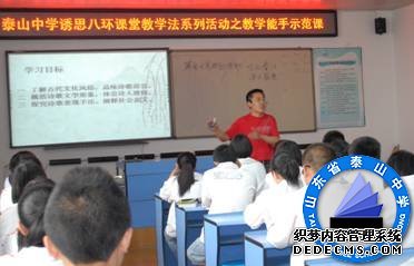 老师们按照“诱思八环课堂教学法”的基本要求,精心备课,给全校教师展示了八节具有泰山中学特色的“八环课 堂教学法”的精彩课,真正起到了示范、引领的作用。全校教师分大文大理进行了听课,同学科教师调课全部进行了听课,老师们深受启发、受益匪浅,使我校的课堂教学改革掀起了高潮,把“诱思八环课堂教学法”的探索引入了深水区,为下学期的课堂教学改革奠定了坚实的基础。