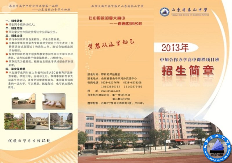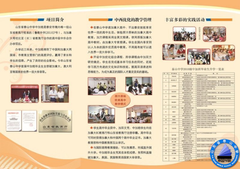 山东省泰山中学中加班是泰安市境内唯一经山东省教育厅批准的(鲁教外字[2010]7号)、与加拿大哥伦比亚(BC)省教育厅合作的高中段中外合作办学项目。