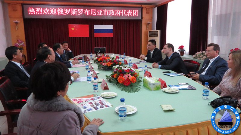 11月10日,我市友好城市俄罗斯罗布尼亚市市长斯梅什利亚耶夫·叶甫盖尼·维克多洛维奇先生,议员涅夫斯基先生等一行4人在泰安市外办张伟主任、市教育局局长张勇华、副局长鞠允平等有关领导的带领下来我校进行交流访问。我校校长周军、副校长宋玉成等领导代表学校与其举行了座谈会。