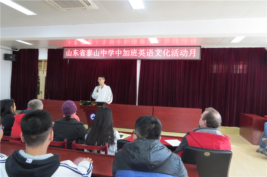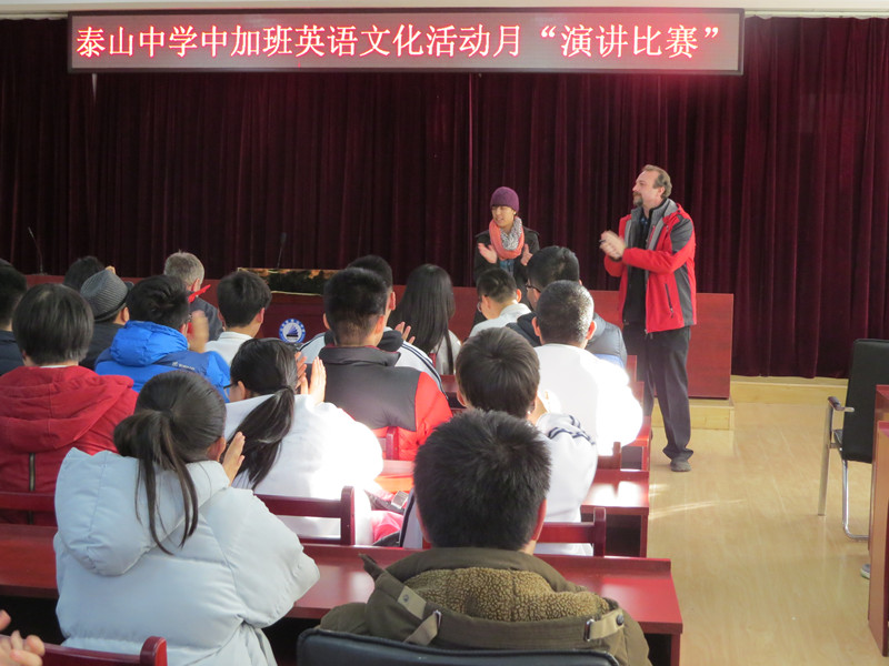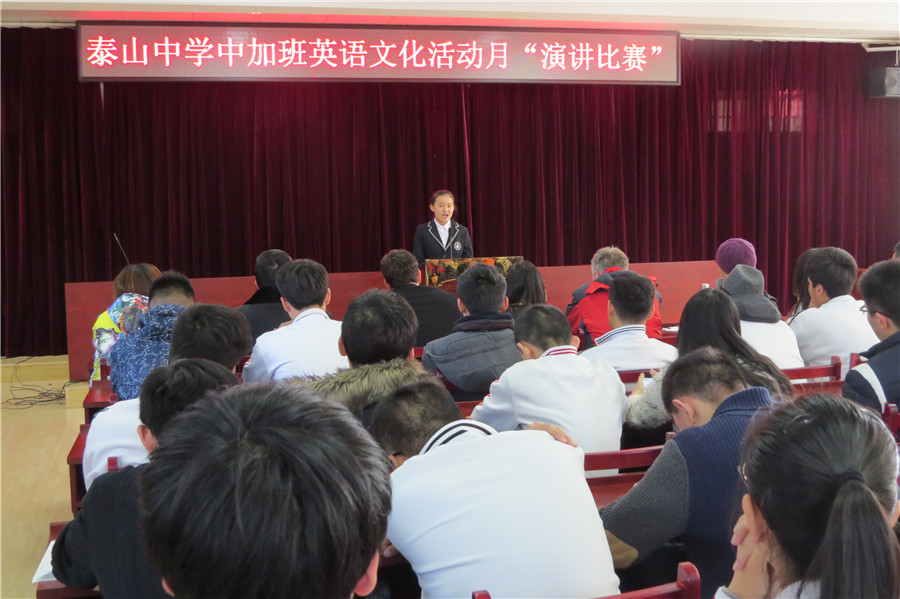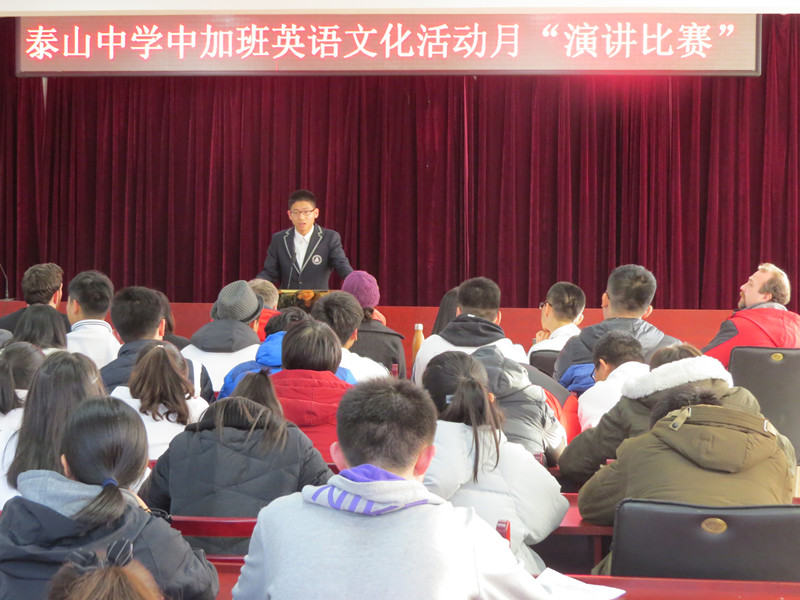 为了提高在校中学生的口语水平,丰富同学们的课余生活, 展示学生的风采,增强学生学习英语的积极性同时增强校园英语学习的良好氛围。12月17日举行了英文演讲比赛。由加方校长Mr. Bartley、加方教师及中方英语教师担任评委。