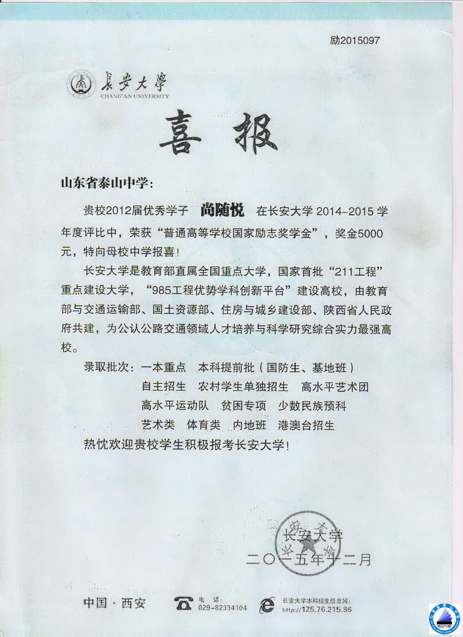 尚随悦同学为我校优秀毕业生,董振壮老师、李德育老师曾担任过该生班主任。初中毕业于省庄镇第二中学,高中就读于我校普通班,高中期间学习勤奋扎实,取得较大进步,高考成绩优异,被长安大学(“211”、“985”、“四省一部共建”)录取。