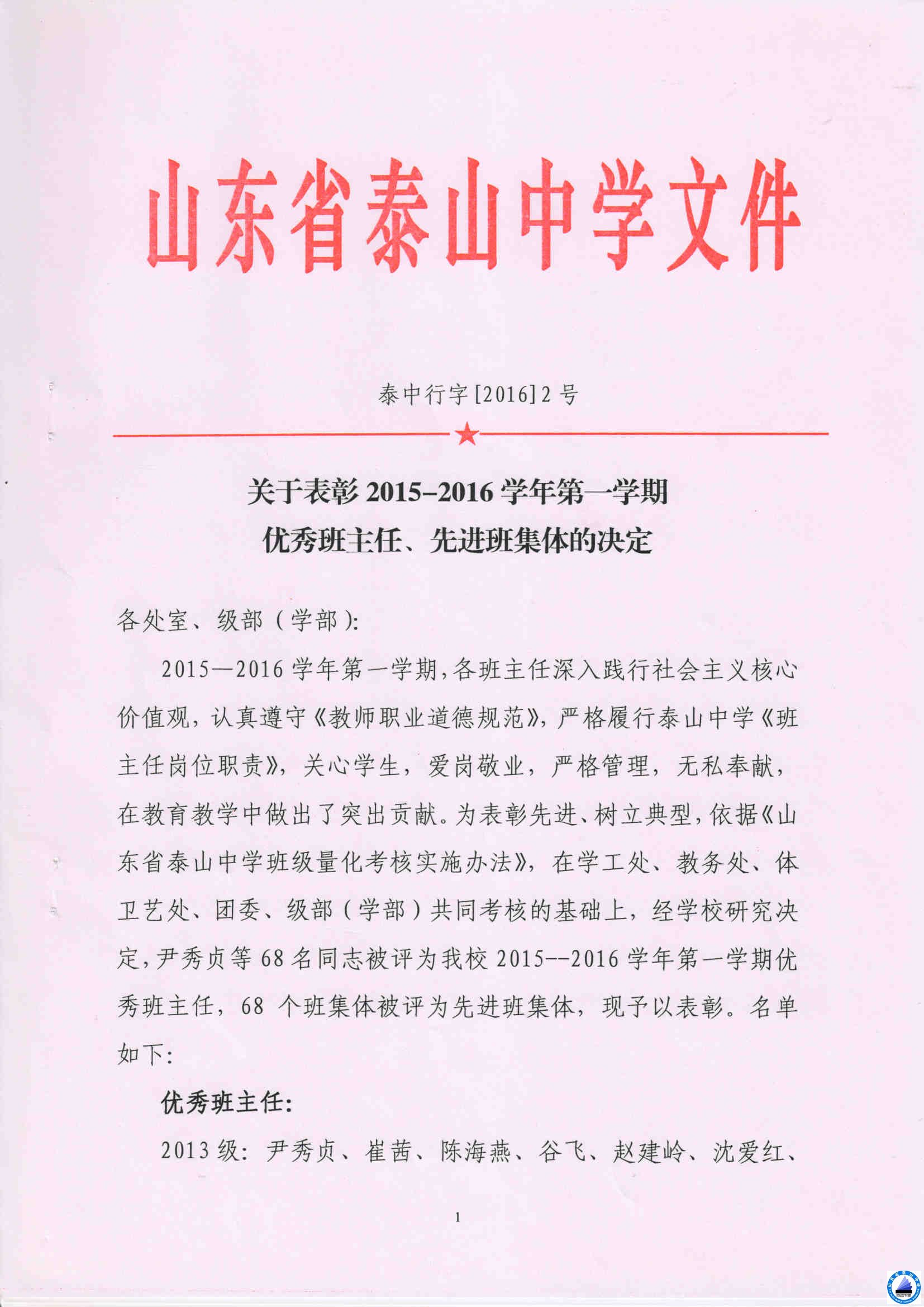 关于表彰2015-2016学年第一学期优秀班主任、先进班集体的决定
