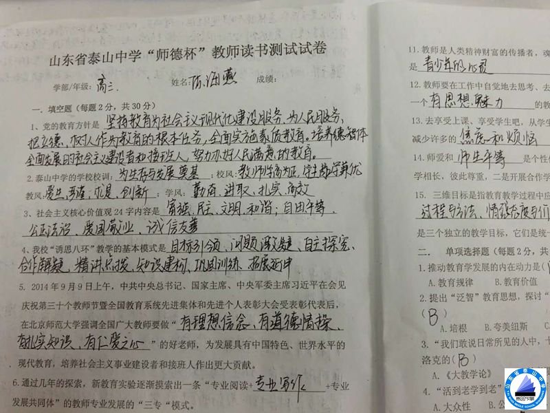 刚走出考场的初中部的焦学敦、王振江老师推心置腹的说,学校根据新课改精神,结合基础教育实践和发展需要,将教师读书作为工作的需要,通过多种形式的读书活动,汲取优秀文化营养,弘扬民族优良传统,有利于教师进一步树立和形成正确的世界观、人生观、价值观。读书测试活动还将由教师读书阅读向学生、家庭、社会辐射,努力营造一个学习型的社会氛围。