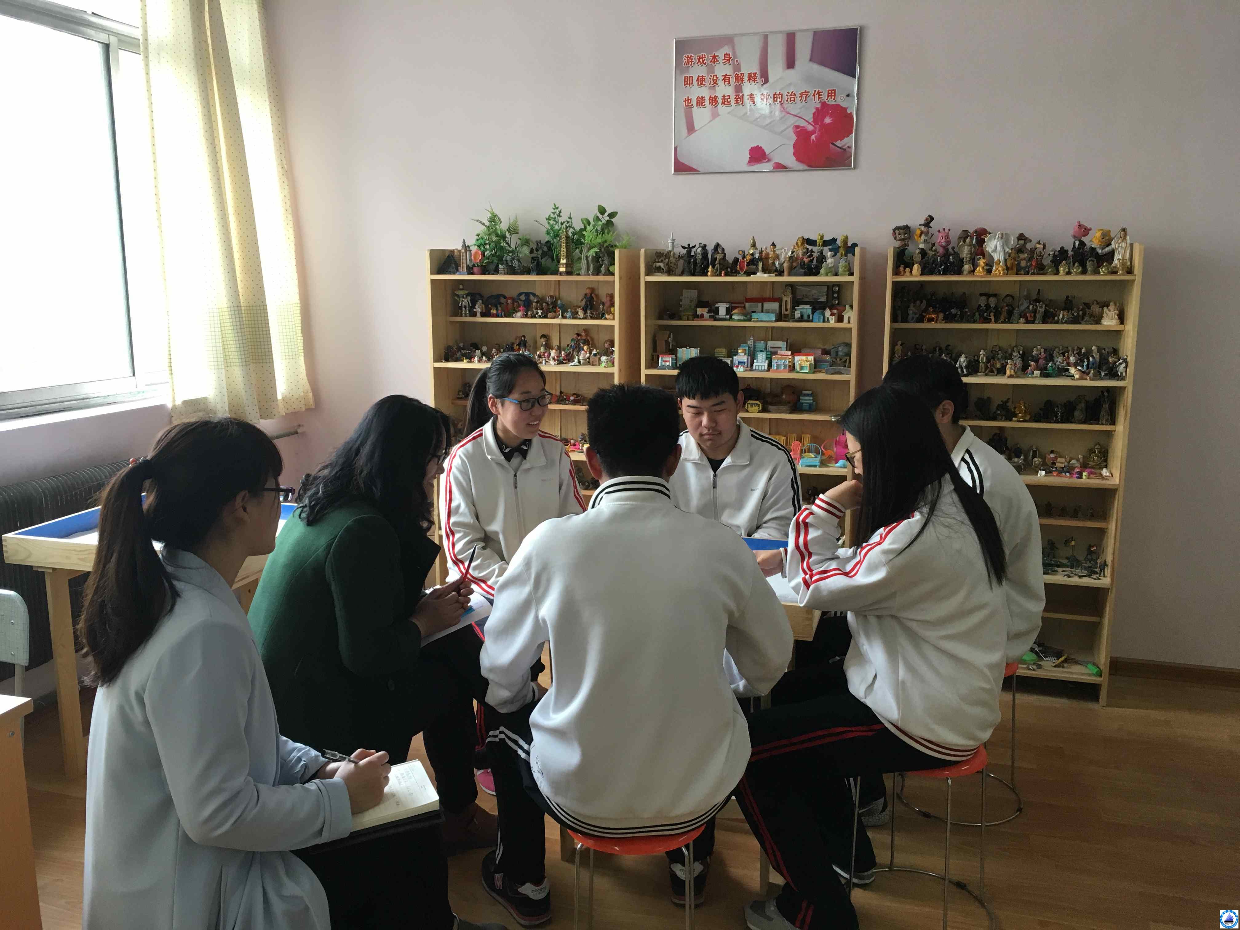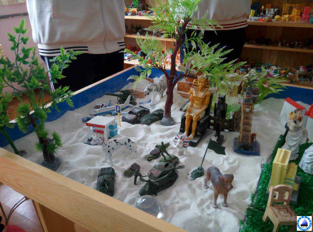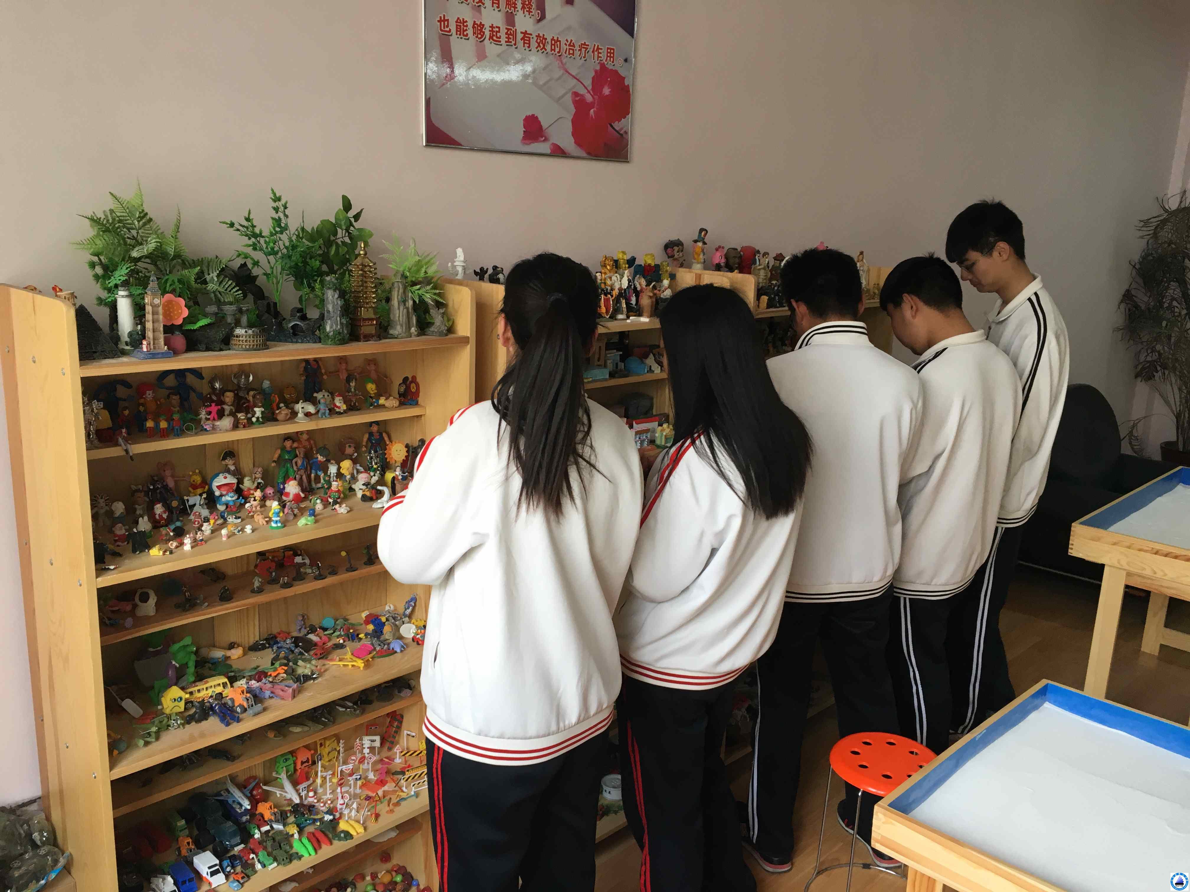 心里治疗室内,有学校收集具有各种象征主题的玩具,包括:各种人物、房屋、家具、栅栏、植物、动物、交通工具、桥梁等。这些小型玩具被摆放在开放的架子上,赵老师向学生介绍沙盘、各种玩具,可以利用这些材料在沙盘上创造出任何图景。