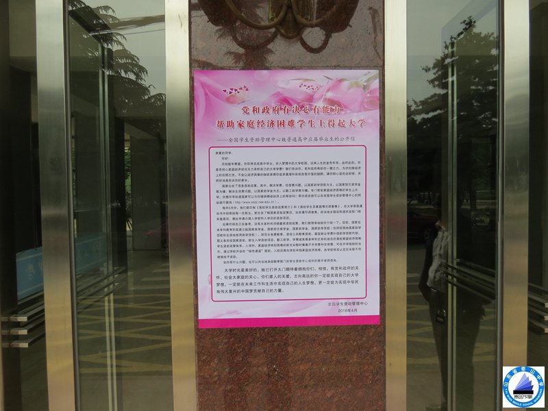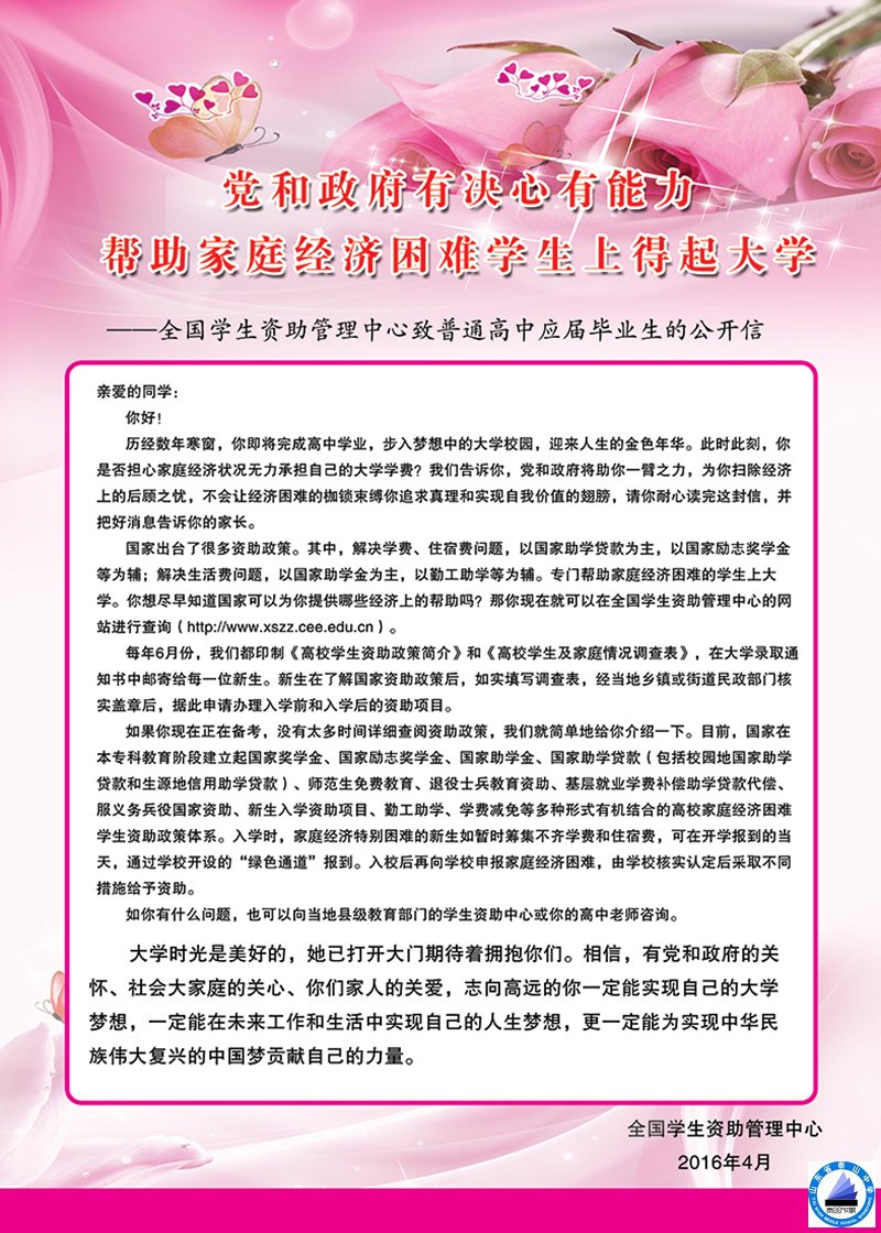 工作中,为每个班级和学生印发了《全国学生资助管理中心致普通高中应届毕业生的公开信》,并张贴于醒目位置,充分利用校园网站、广播、宣传橱窗、LED电子显示屏、校报等载体大力宣传学生资助政策,通过主题班会、国旗下演讲、开设学生资助咨询电话、家校联系微信群、QQ群等形式向家庭困难学生答疑解惑,解除困难学生家庭的后顾之忧。