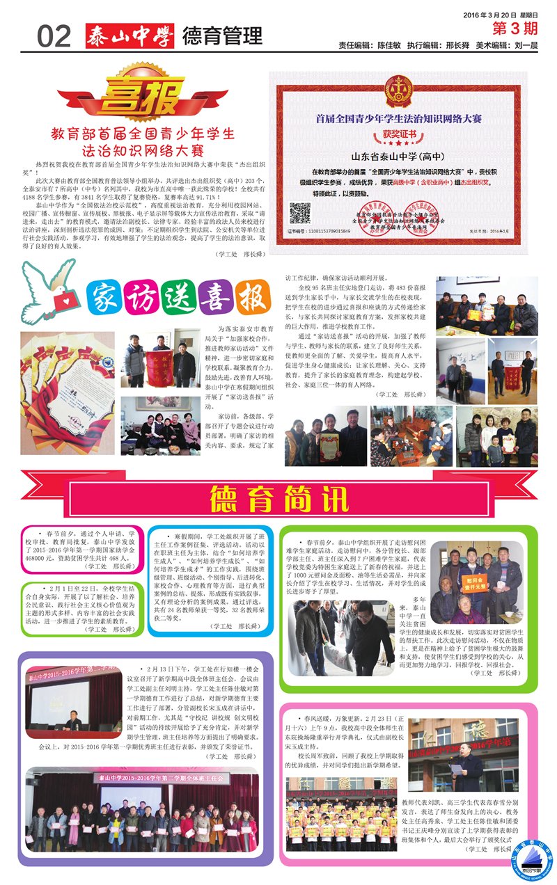 多年以来,泰山中学高度重视学生资助工作,学生资助工作领导小组定期深入贫困学生家庭走访慰问,了解家庭情况,向家长宣传政府资助政策,介绍学生在校学习、生活情况,鼓励学生努力学习,听取学生家长的意见建议,受到社会的一致好评。