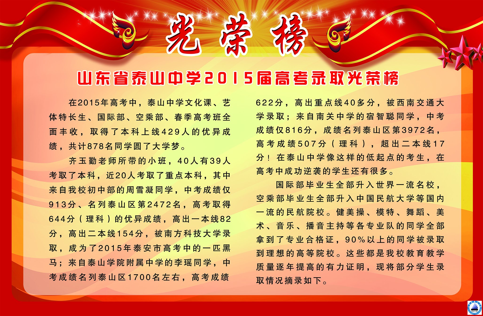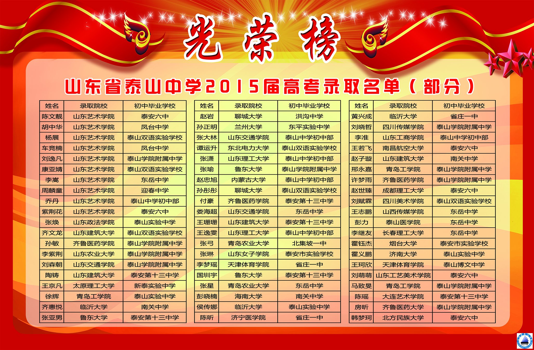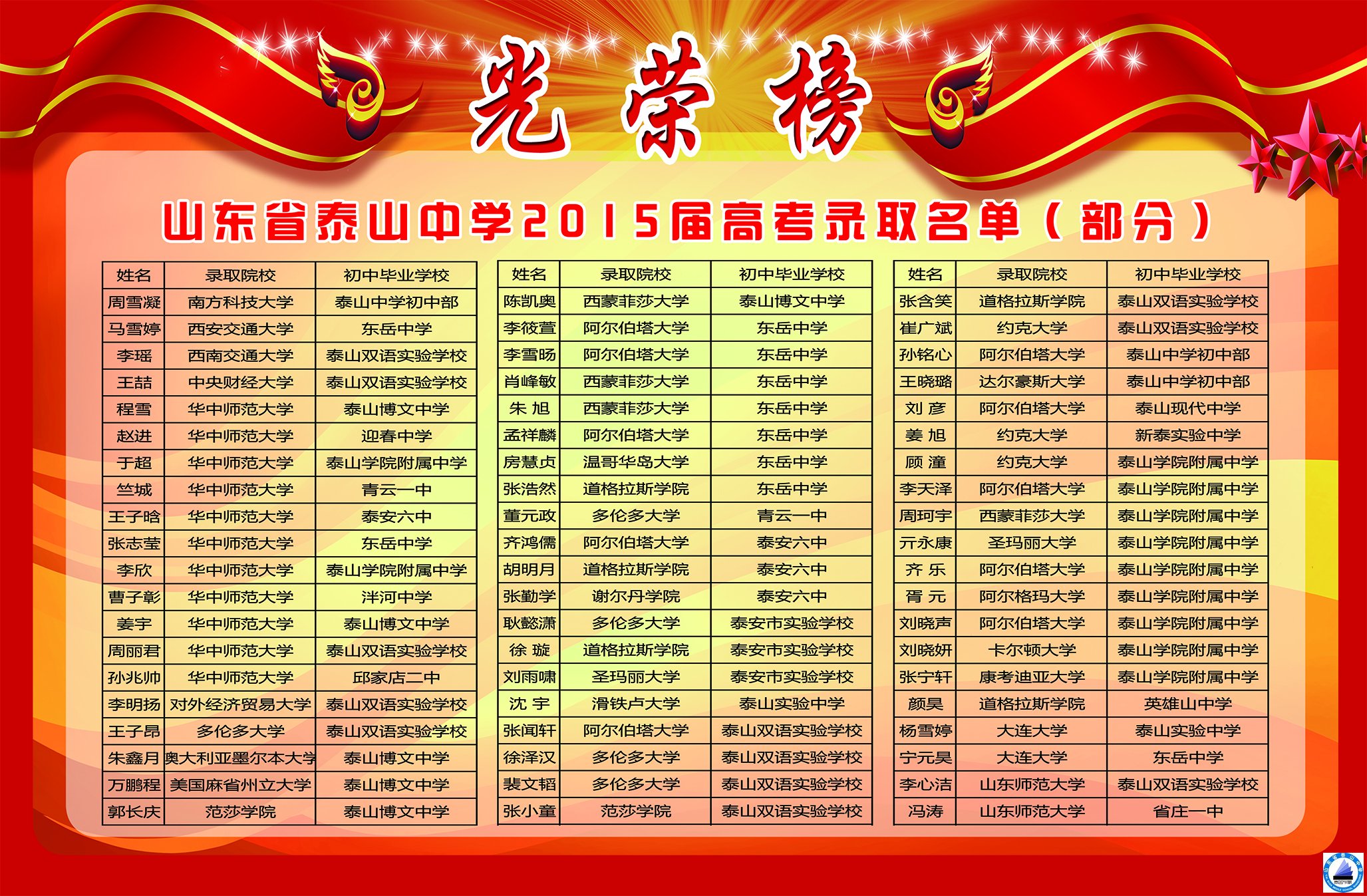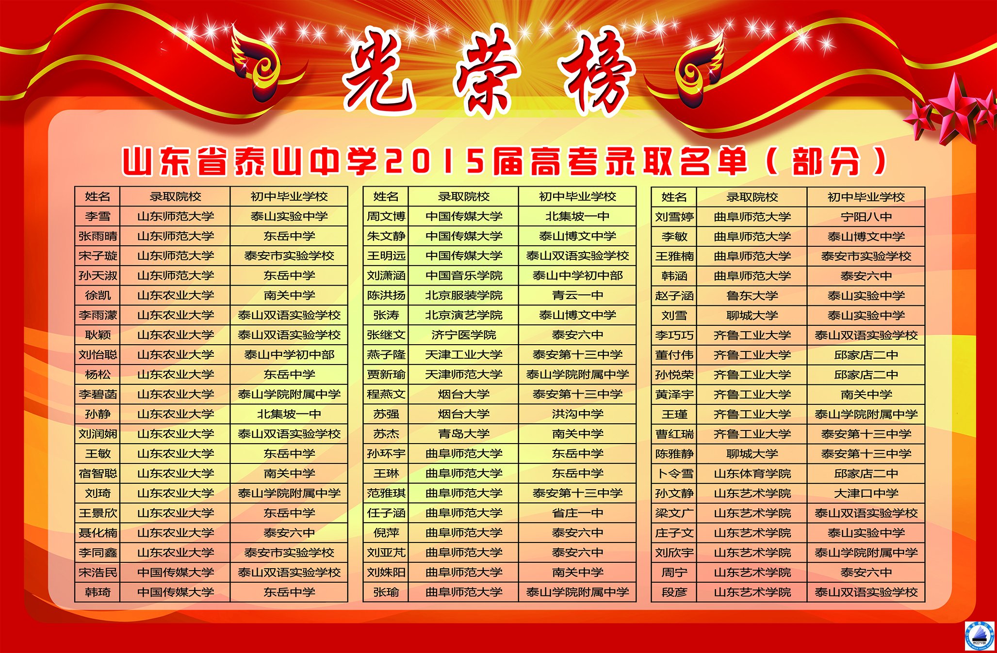 泰山中学2015届高考录取光荣榜