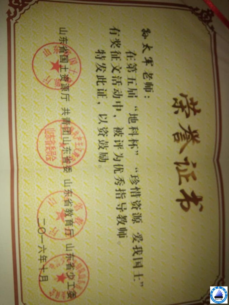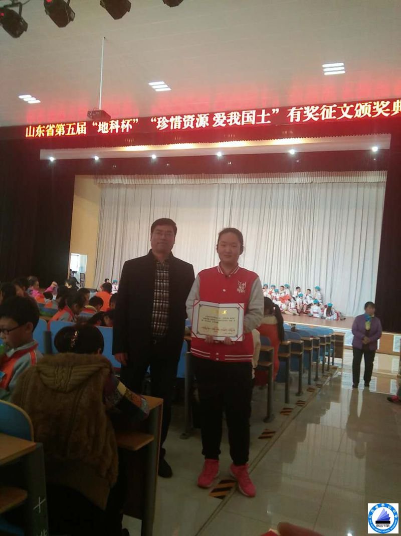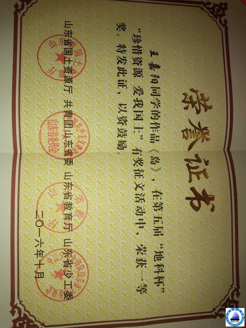 2016年10月29日,在山东省第五届“地科杯”征文比赛中,我校高三年级的王嘉阳同学荣获一等奖,孙太军老师获优秀指导教师奖。这是我校坚持科技兴校战略的又一硕果.