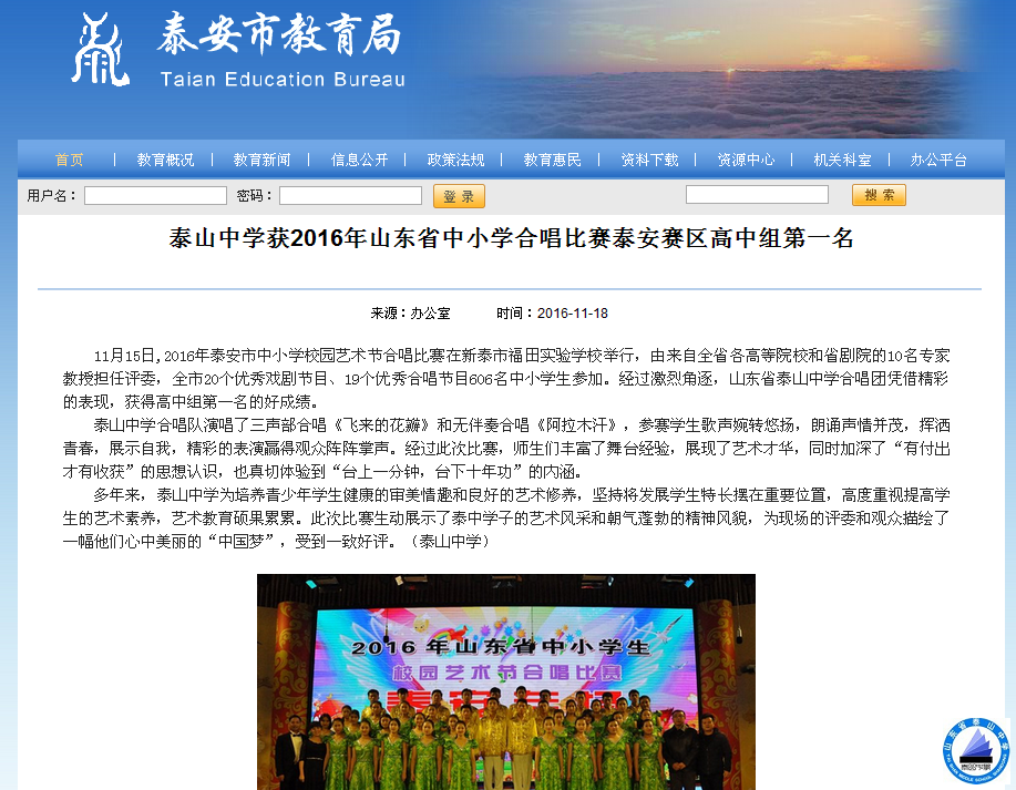 11月18日,泰安市教育局报道我校在2016年山东省中小学合唱比赛中获奖新闻。