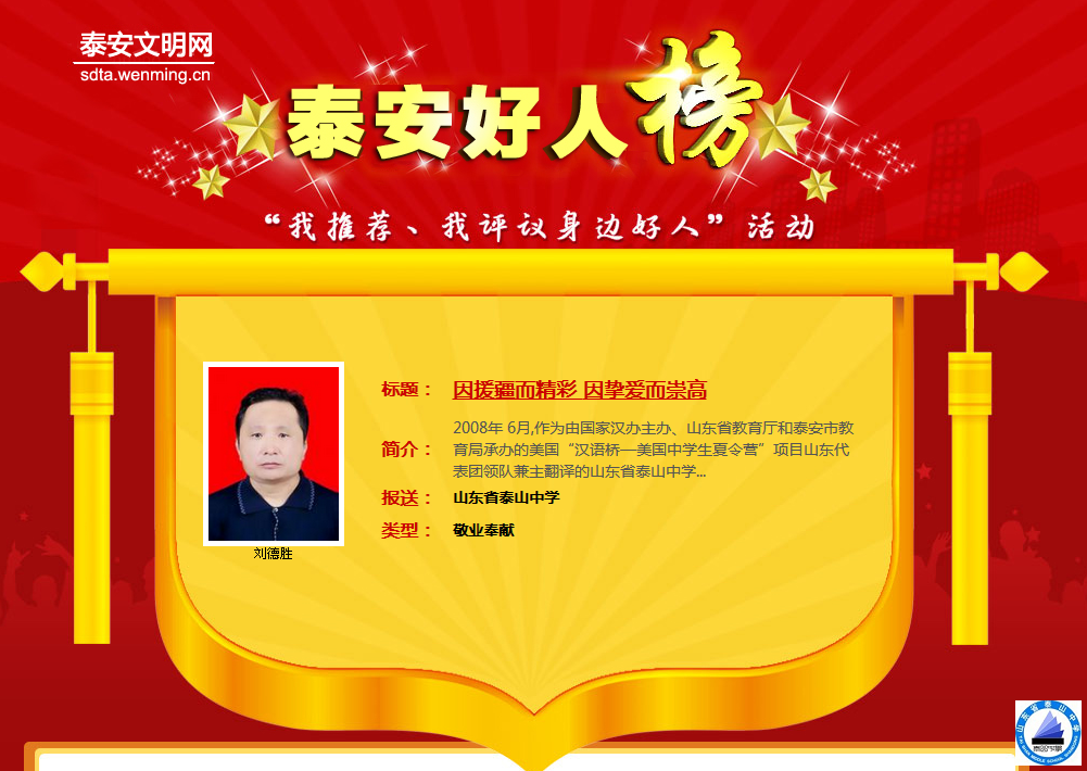 经广大群众推荐,泰山中学刘德胜老师被泰安市文明办推选为2016年11月份敬业奉献类“泰安好人”。