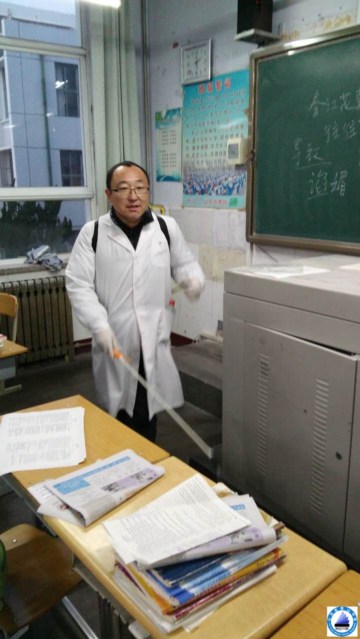 自入冬以来,感冒肆虐。因担心高三学生感冒影响学习,23日下午,医务室孟老师亲自背着装满消毒液的喷雾器,到高三年级各个教室喷洒消毒液。几十公斤的消毒呀,从一楼到五楼,孟老师笑呵呵的喷洒着,不放过任何一个死角。学生们都自觉地配合孟老师工作。