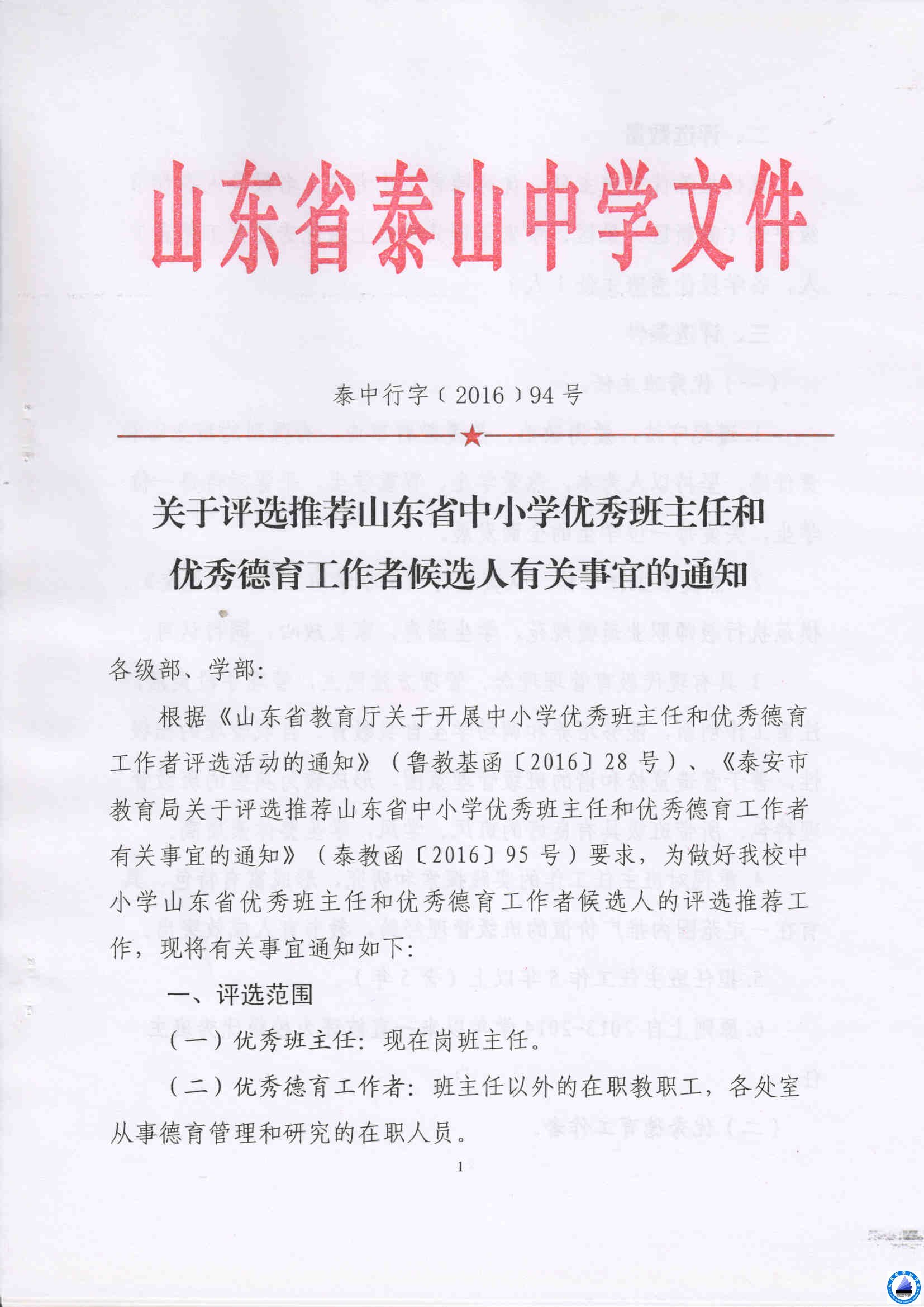 关于评选推荐山东省中小学优秀班主任和优秀德育工作者候选人有关事宜的通知