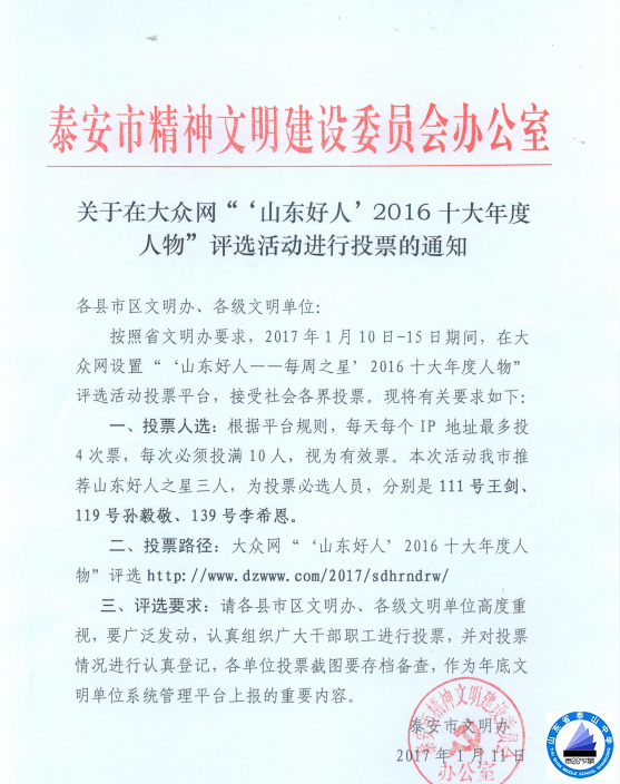 关于在大众网“山东好人”2016十大年度人物评选活动进行投票活动的通知