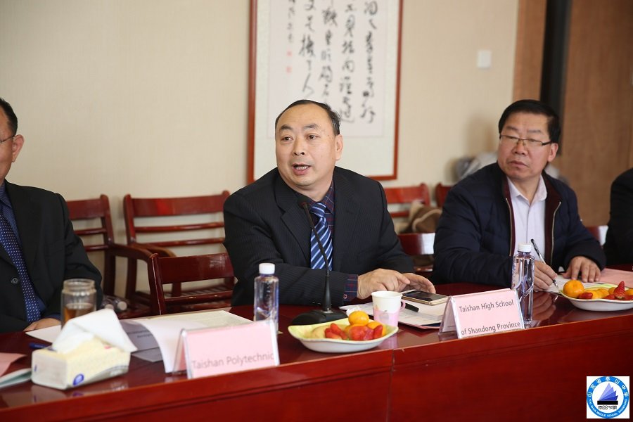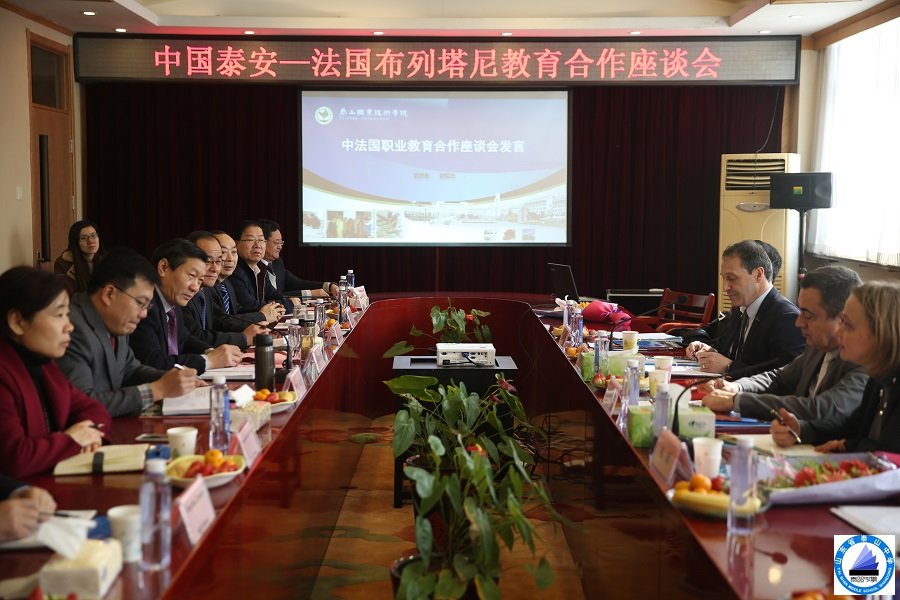 参观结束后,访问团一行在山东省泰山中学举办了中国泰安—法国布列塔尼教育合作座谈会。泰安市教育局副局长鞠允平先生、泰安市教育局外事办主任王亮先生、泰安市教育局外事项目负责人陈峰先生及泰山职业技术学院、山东服装职业学院、岱岳区职业教育中心、泰安一中、泰安二中、山东省泰山中学、泰山学院附属中学、泰安市实验学校8所学校的领导出席了本次教育合作座谈会。会上布列塔尼大区雷恩学区长蒂埃里·特雷特先生介绍了本区的教育情况,各学校简要介绍了本校的对外交流合作情况。周军校长就我校汉语国际推广基地相关工作,加拿大、法国、韩国等友好学校的交流情况以及中外合作办学范例—中加班的运作情况进行了经验介绍。中法双方就合作事宜展开了热烈讨论,并达成了在学生互访、教师互派及合作教育等方面的初步合作意向。