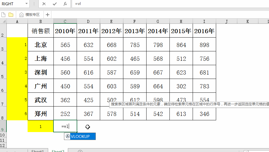 公式=VLOOKUP($B$9,$A$3:$I$8,MATCH(C2,$A$2:$I$2,0),0)