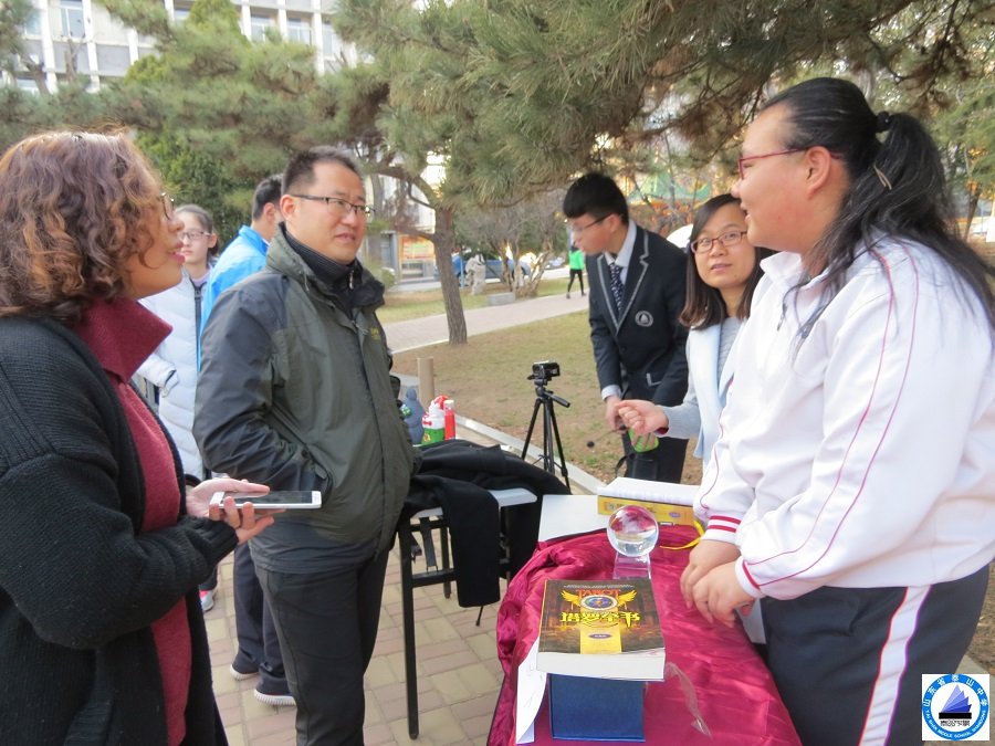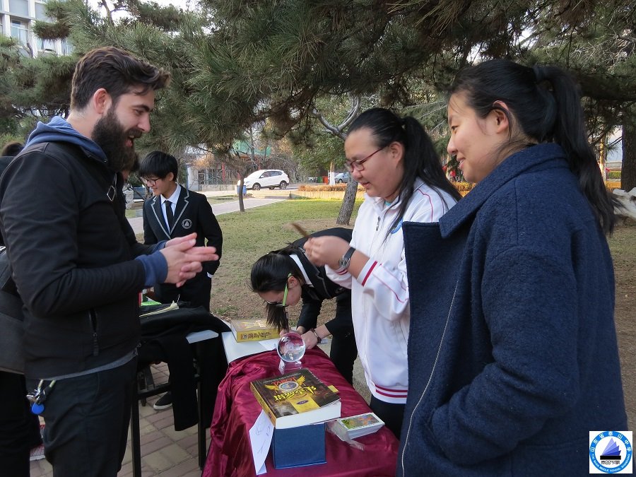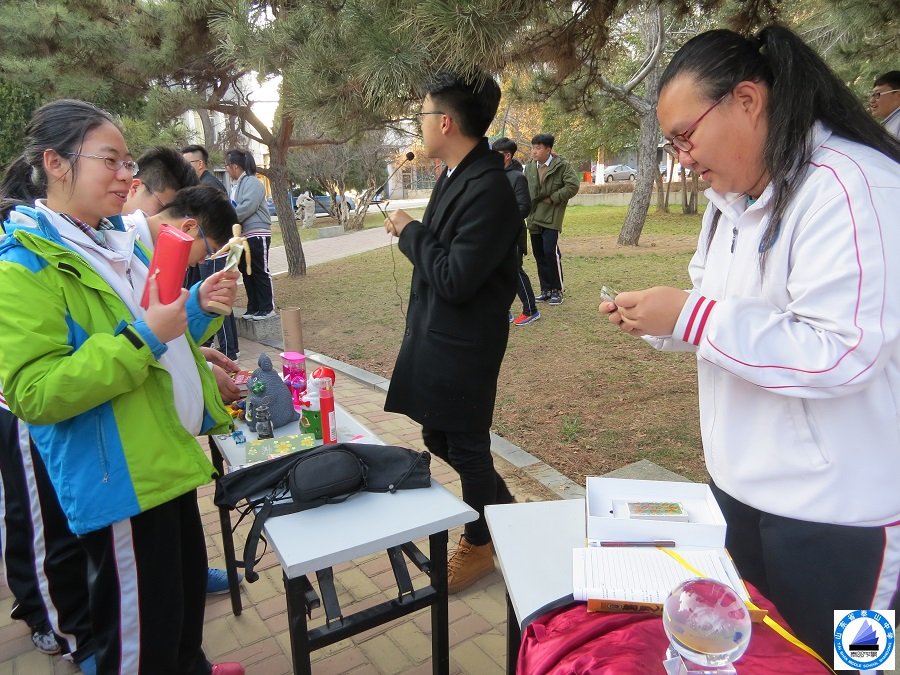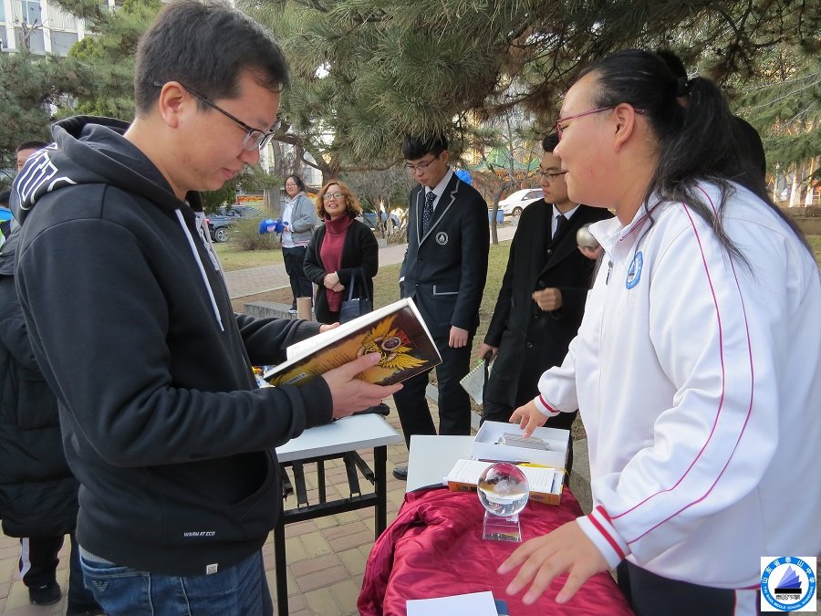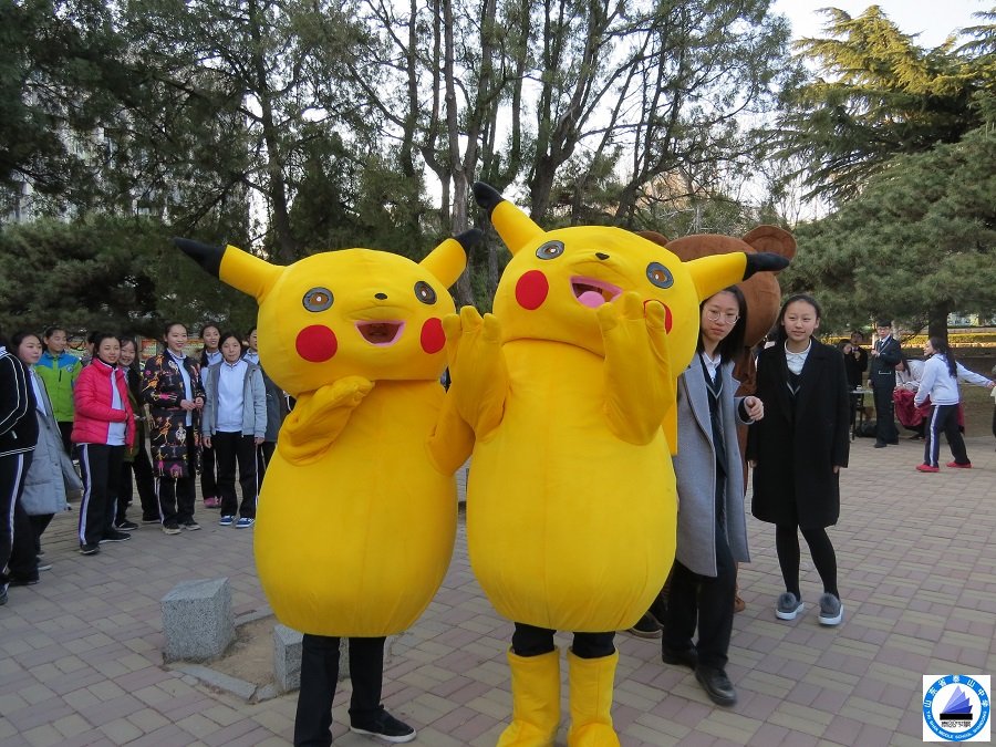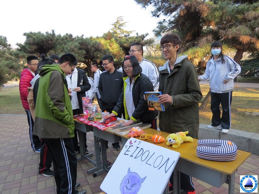 中加班的各班级在办公楼前的花园内摆桌设摊,摆满了学生们捐出的文具、图书、玩具、食品等。同学们精心布置了自己的展区,各具特色,利用各种促销手段吸引顾客,推销员们更是使出浑身解数向买家们推销自己的宝贝。高一二班的同学们装扮成可爱的皮卡丘招揽顾客,高二一班的同学们还倾情演唱,用歌声奉献出自己的一份爱心。同学们的淘宝热情很是高涨,不少中方和加方的老师也纷纷被吸引加入淘宝的行列。加方教师Daniel和Dona的演唱更是将义卖的气氛推向了高潮,李爱琴老师也即兴起舞,全场掌声不断。