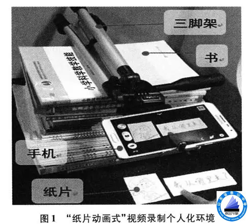 如图1所示:书、三脚架(支架设备)+手机(摄像设备)+纸片(呈现素材)。这样的配置方便教师在家或者办公室都可以制作微视频,录制环境最好是在光线充足的地方。若手部阴影影响拍摄画面的质量,可在旁边添置台灯来消除阴影。制作纸片动画微视频所需要的硬件设备在日常生活和工作中都已经普遍使用。如果录制好的视频需要修剪,只需要借助电脑下载非编软件进行剪辑即可。其中,会声会影、Premiere、Vegas等都是一些常用的非编软件,可以根据个人需要和喜好进行选择。