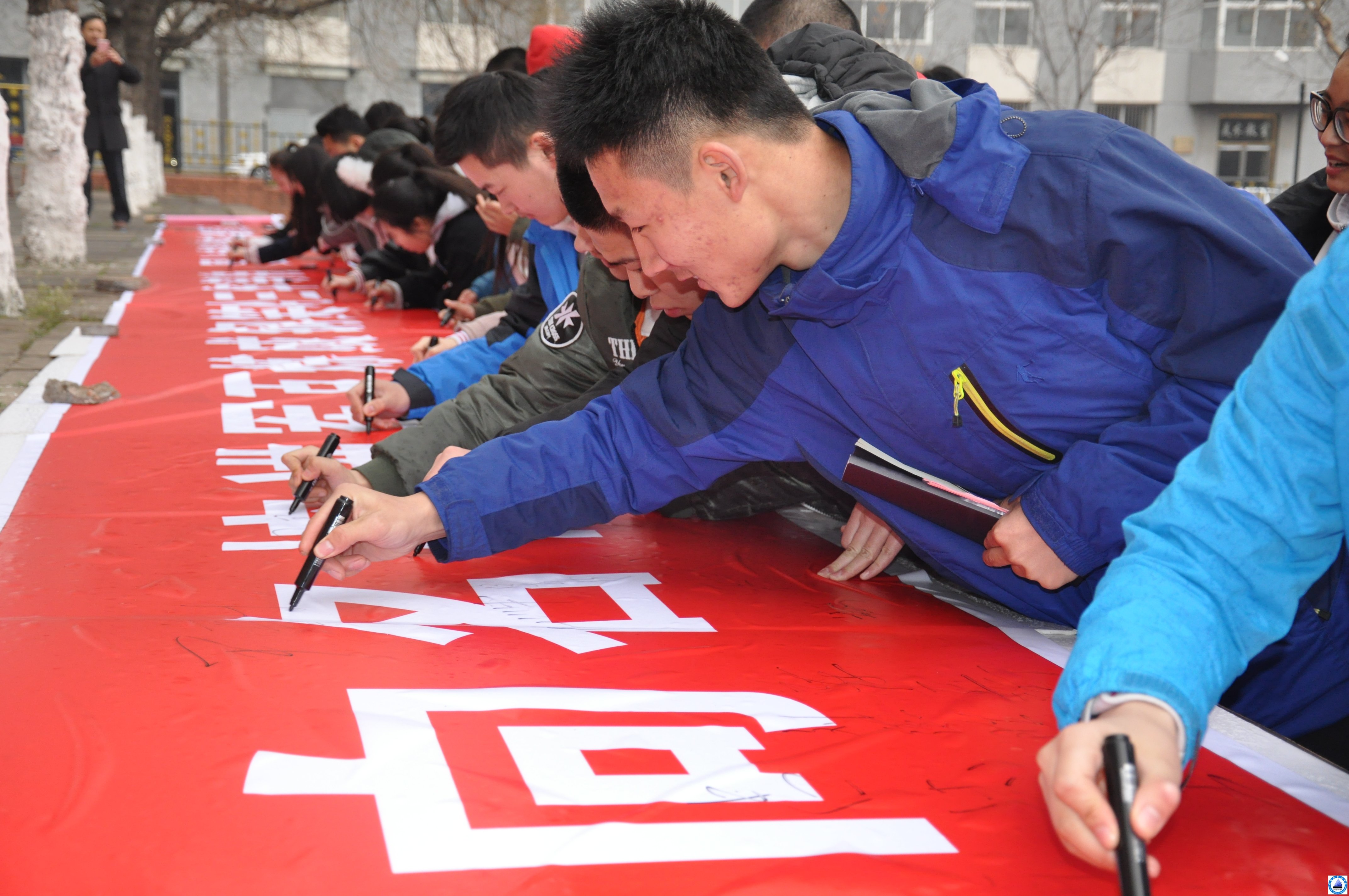 场面壮观,震撼感人,活动也迎来高峰。宣誓完毕,全体师生来到印有“向名校进军百炼成钢唱出青春无悔,圆人生梦想半载奋斗笑吟三年等待” 等字样的巨型横幅前,郑重签名。