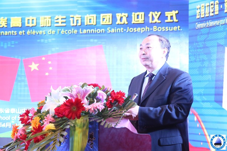 我校在多功能厅举行了欢迎仪式。仪式上,周校长对访问团的到来表示热烈欢迎,从学校规模、学科建设等方面简要介绍了我校的基本情况,指出我校高度重视国际交流与合作工作,与国外多所高中建立了多种形式的良好合作关系,希望通过访问团的访问,进一步推动两校之间的学术和文化交流。法国友好学校波舒埃高中Yanne女士对我校的热情接待表示感谢,对来到办学历史悠久的山东省泰山中学访问表示荣幸。他们十分希望与我校进一步开展法语及汉语特色教学工作,并促进双方在人才培养以及文化交流等方面的深层次合作。中法双方的师生还准备了精彩的节目互动,现场气氛热烈。