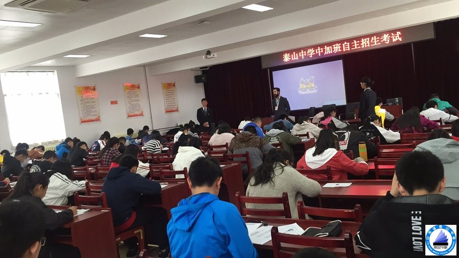 上午9时,自主招生考试在我校会议室举行,来自泰山学院附属中学、泰山双语学校、泰安第六中学、泰安市实验学校、东岳中学、泰山博文中学、泰山中学初中部的近百余名同学报名参加本次考试。本次考试持续2个半小时,考试内容为英语听、说、读、写四部分,由中加班外教进行一对一面试,测评英语口语能力及综合素养。