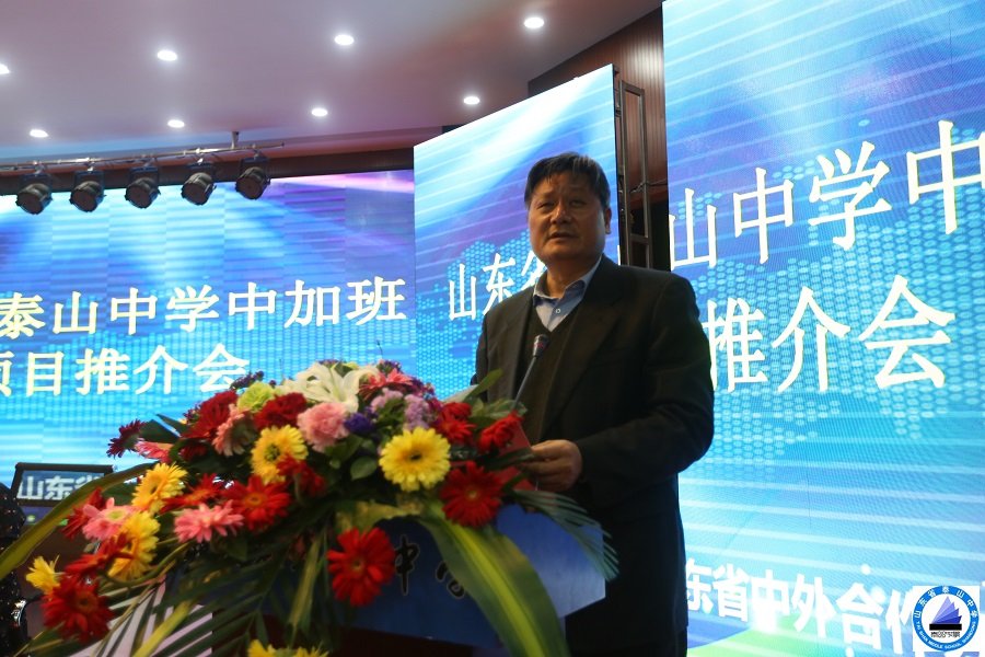 与此同时,我校中加班项目推介会在报告厅举行。泰安市教育局副局长徐炳伦、我校校长周军、副校长宋玉成、中加班加方校长Mr.Dan、国际部主任孔庆国、各初中学校代表、家长代表、媒体人员及初中毕业生家长共两百余人参加了此次推介会,会议由宋玉成副校长主持。