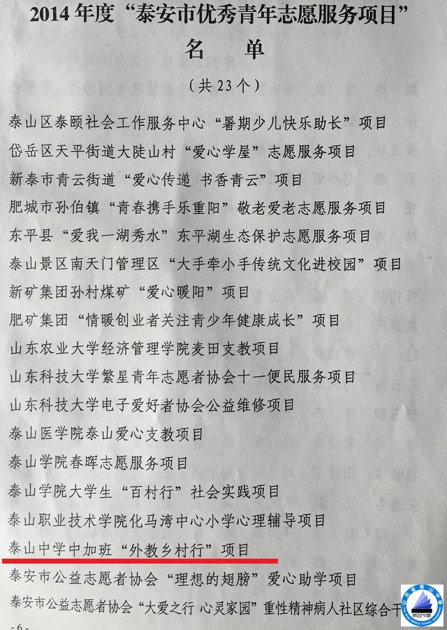 泰山中学中加班的教师和学生们一直致力于志愿服务,中加班的“外教乡村行”项目被评为2014年度“泰安市优秀青年志愿者服务项目”,是全市唯一一个基础教育阶段获此殊荣的项目。中加班的师生们还积极利用周末和假期时间参与义务植树、阳光旅游便民服务等志愿活动,曾应邀参加“2015中国泰山教育公益嘉年华”活动,产生了广泛的社会影响。