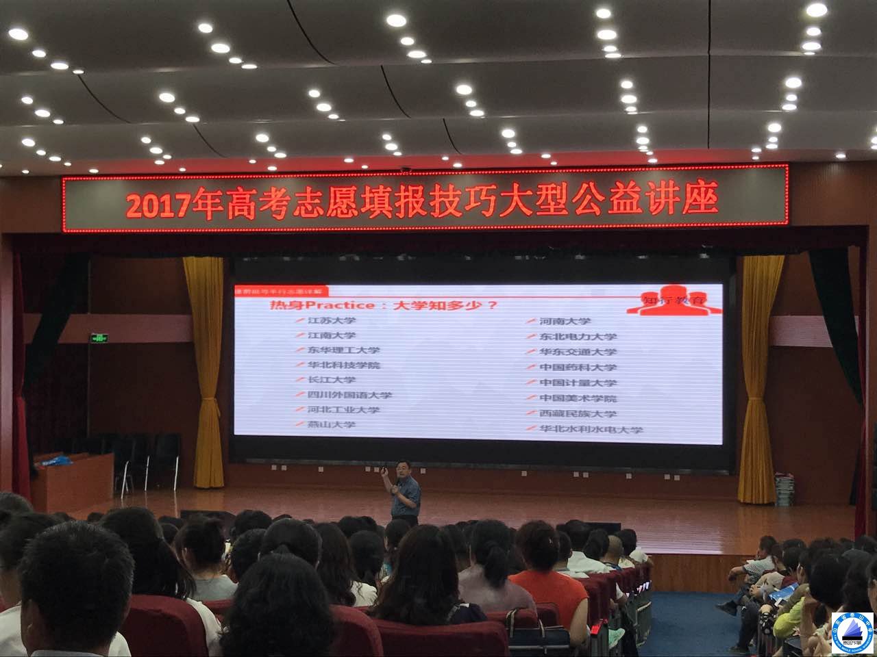 6月1日上午,高三年级在学术交流中心举行高考志愿填报技巧大型公益讲座,全体家长参加了讲座。此次讲座由泰安知行教育创新研究院院长,高考志愿填报专家曲涛先生就志愿填报流程、注意事项、最以及如何做出最佳选择等做了详细讲解。针对我校高三年级学生实际情况,具体问题,具体分析,制定出了有针对性的、详细的最有计划。并为同学们剖析了定向生,中外合作办学,民族预科班等多种报考方式,家长和同学们都被曲老师的诙谐幽默所感染,纷纷表示受益匪浅,为高考提供了更多的机会,为明天提供了更多可能。