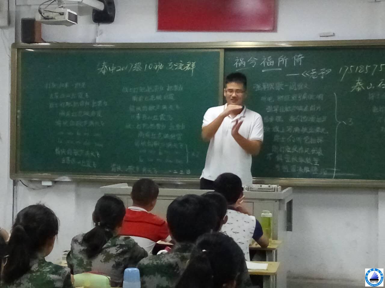 这不,紧张的军训之中,泰山中学高一新生们高兴的见到了自己的学兄学姐们——今年刚从泰中毕业的学长们,他们有原高三班主任石峰老师班级的学生代表,如有升入东华大学的刘云山,青岛科技大学彭锦诚,考入青岛农业大学的李斐扬,考入烟台大学的郑士瑶,也有原高三班主任耿庆民老师班级的学生代表,如考入浙江传媒学院的王嘉阳,考入武汉音乐学院的曲广政等同学。