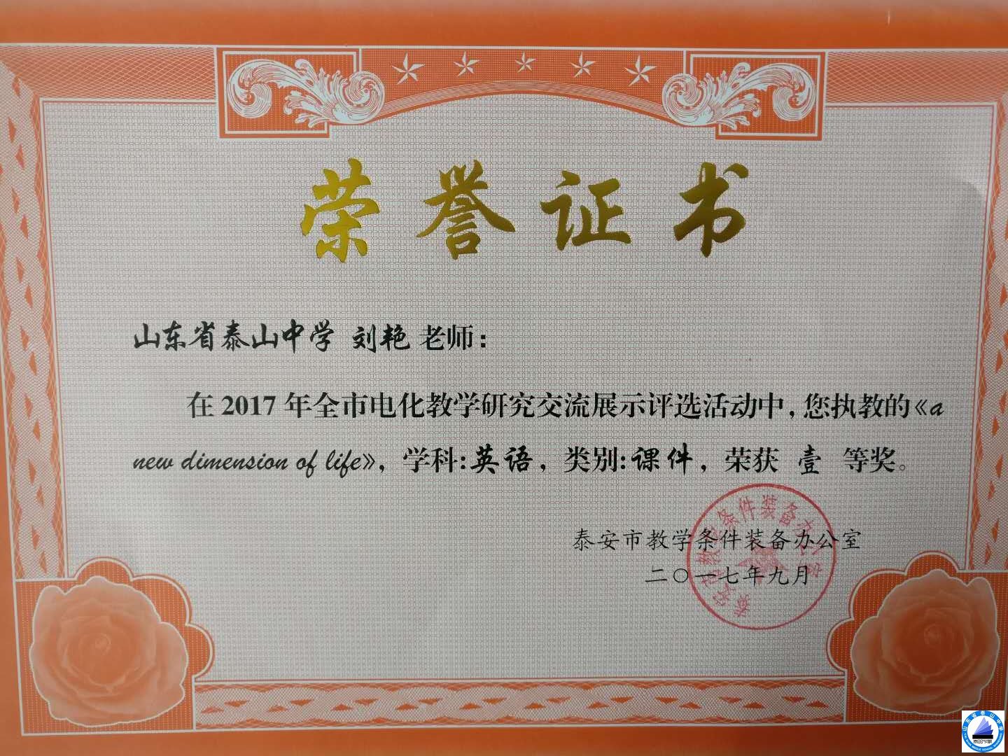 刘艳老师执教的《a new dimension of life》荣获英语课件一等奖;