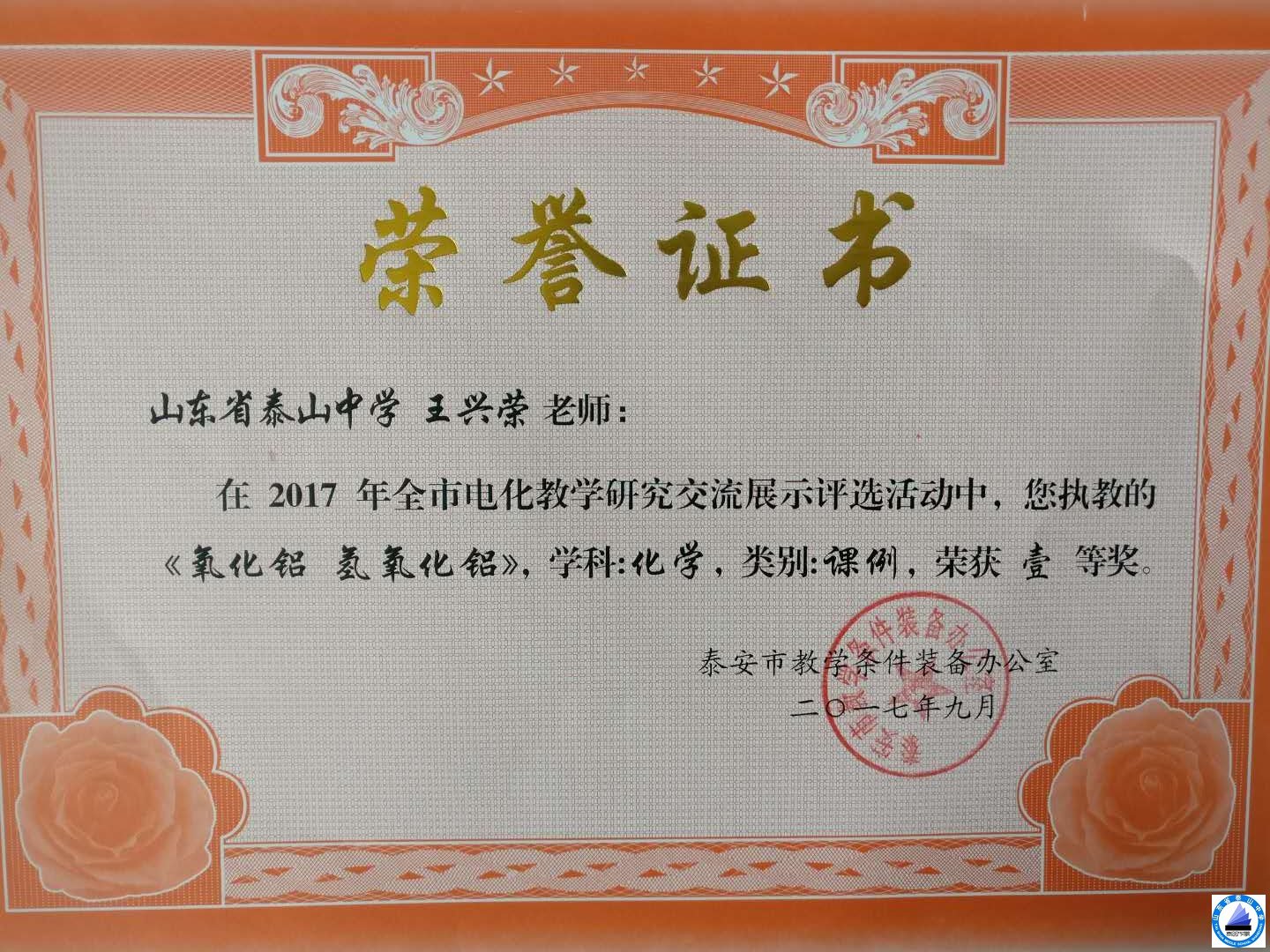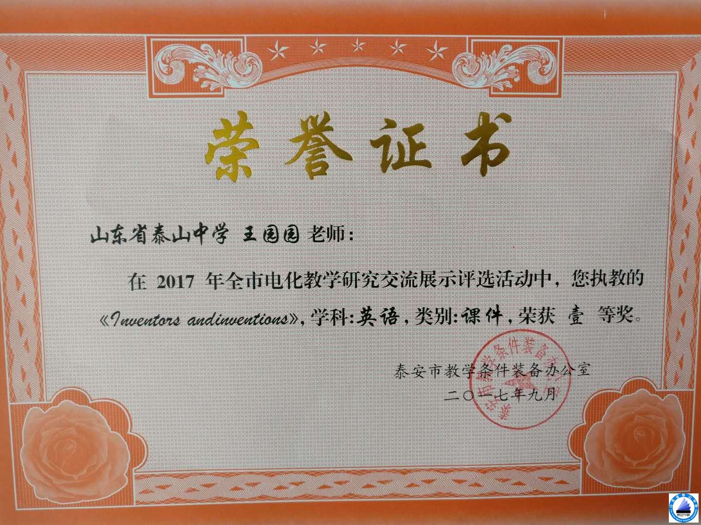 王园园老师执教的《inventors and inventions》荣获英语课件一等奖; 孔丽老师执教的《the lake of heaven》荣获英语课件一等奖; 王兴荣老师执教的《氧化铝 氢氧化铝》荣获化学课例一等奖。