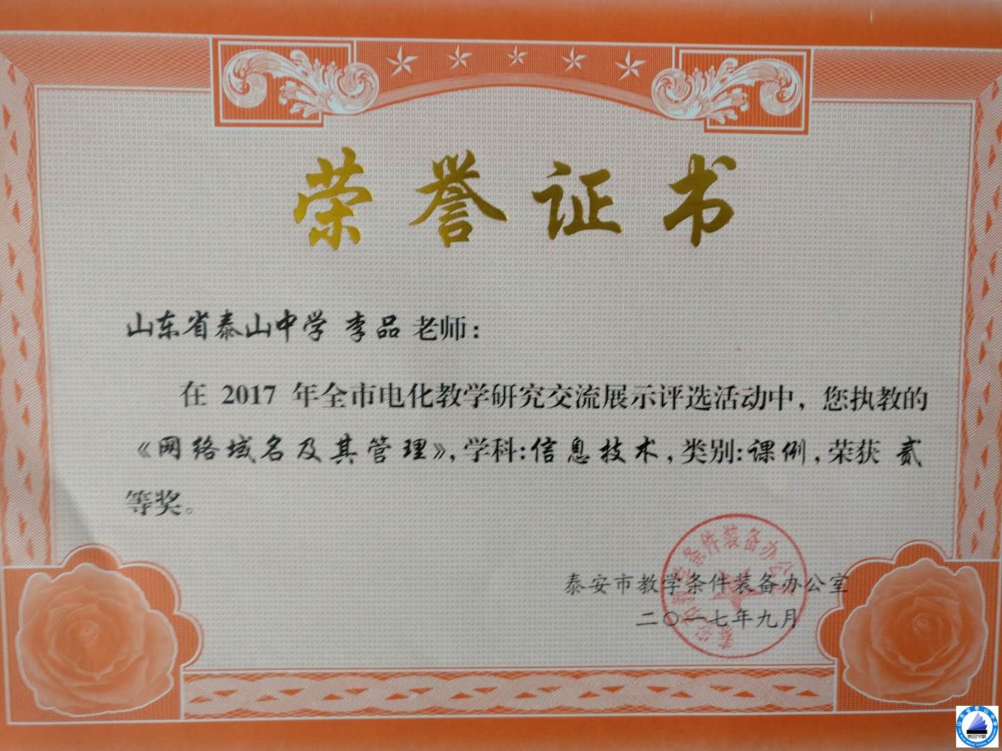 李品老师执教的《网络域名及其管理》荣获信息技术二等奖;