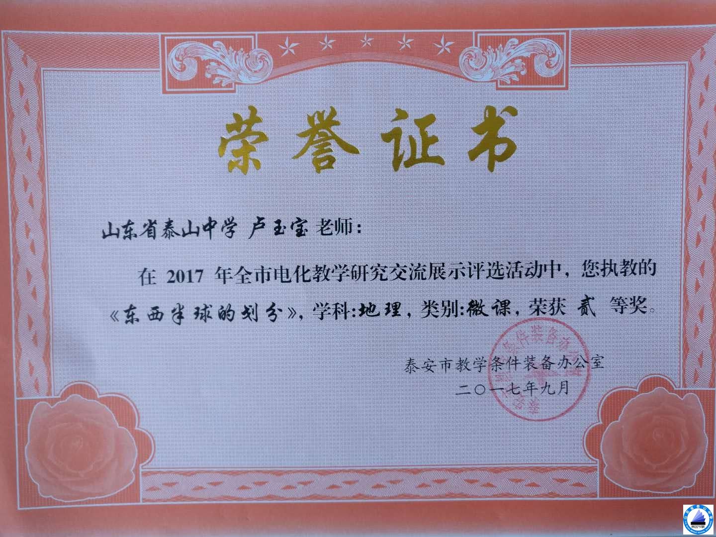 卢玉宝老师执教的《东西半球的划分》荣获地理微课二等奖;