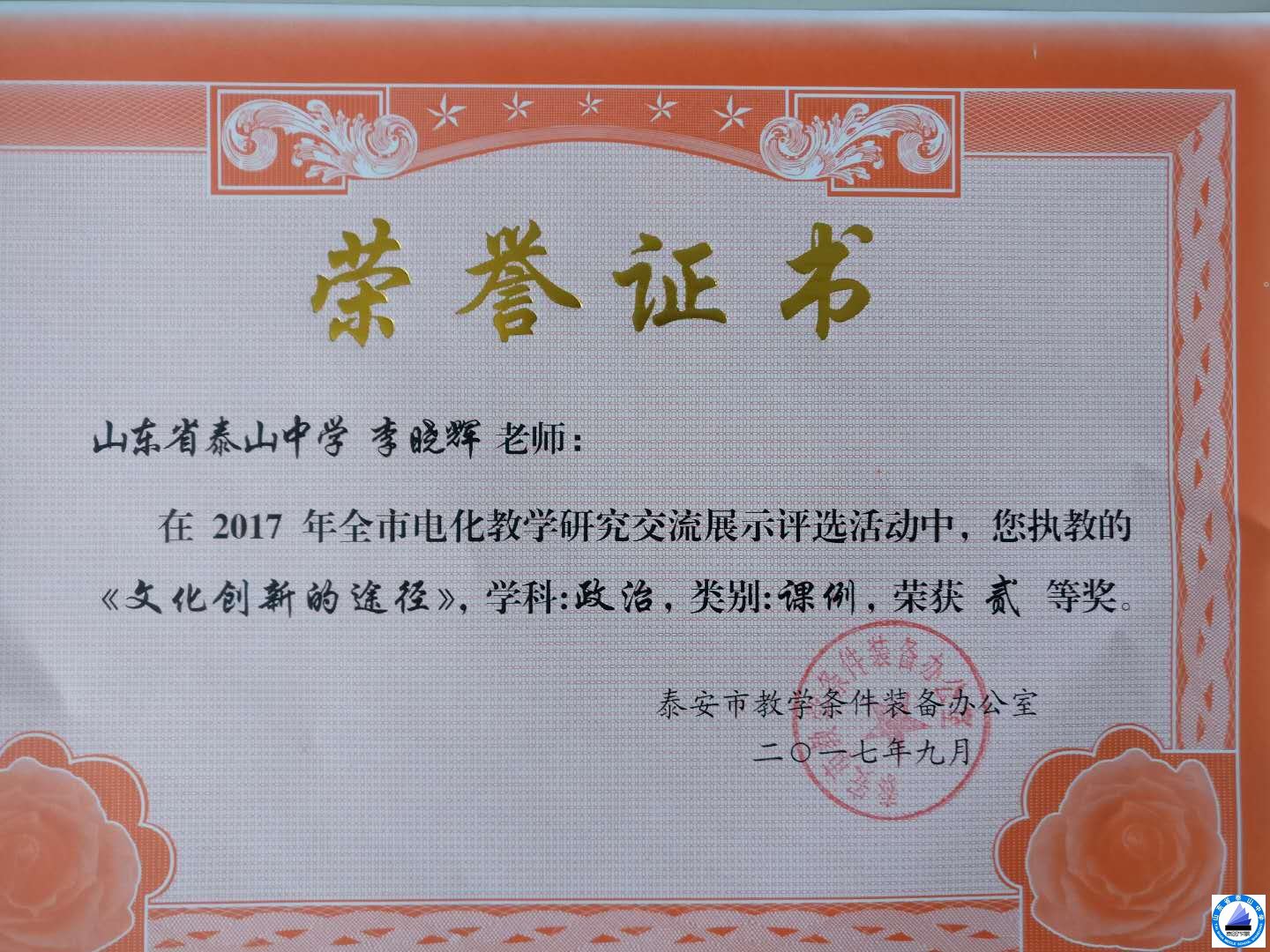 李晓辉老师执教的《文化创新的途径》荣获政治课例二等奖;