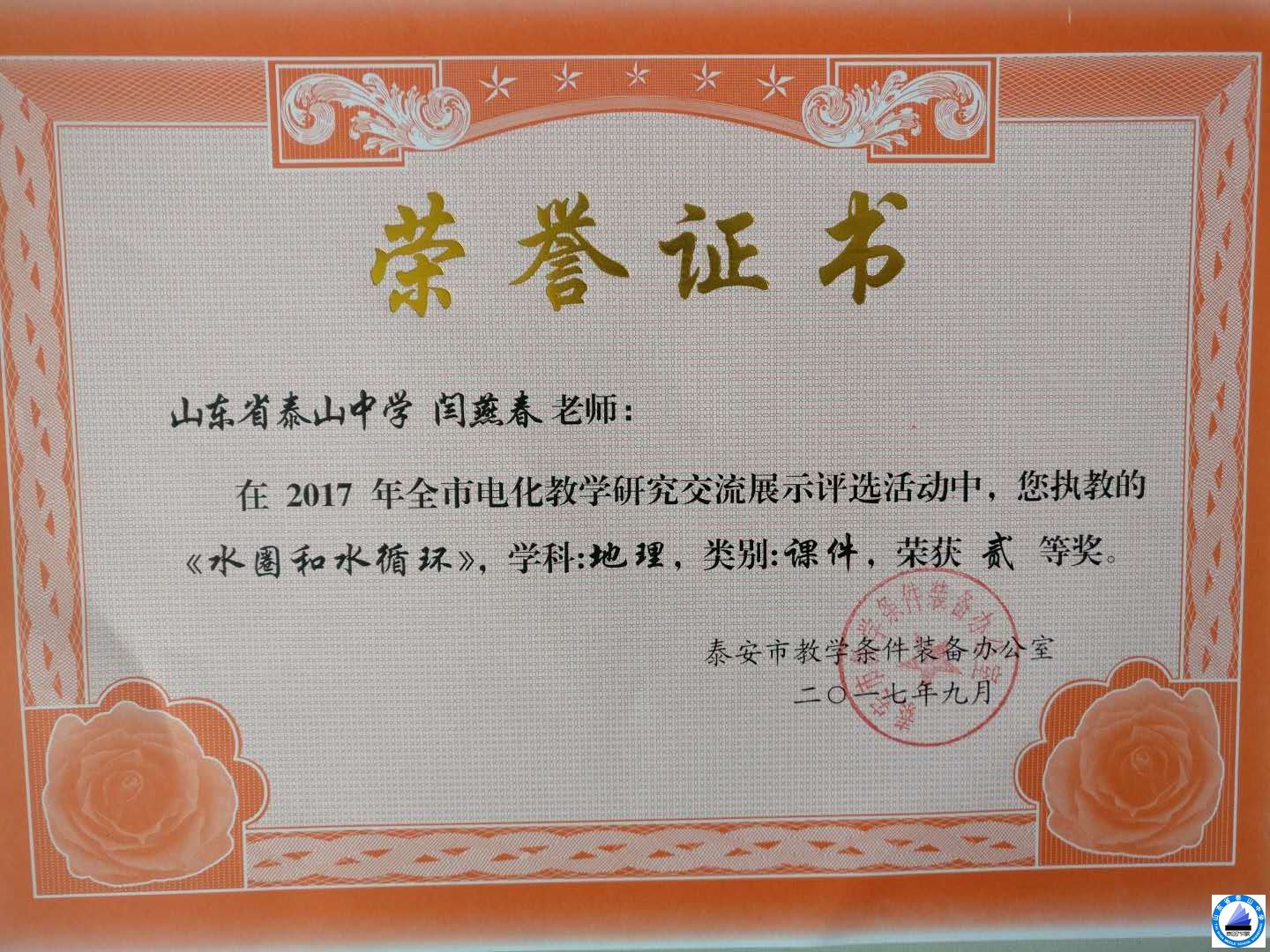 闫燕春老师执教的《水圈和水循坏》荣获地理课件二等奖;