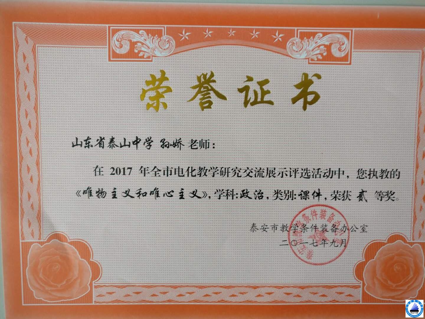 孙娇老师执教的《唯物主义和唯心主义》荣获政治课件二等奖。