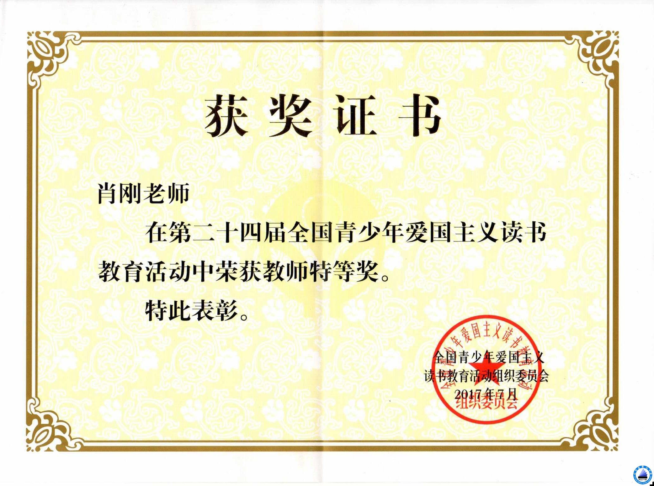 热烈祝贺肖刚老师荣获第二十四届全国青少年爱国主义读书教育活动教师特等奖