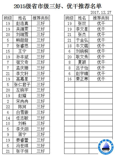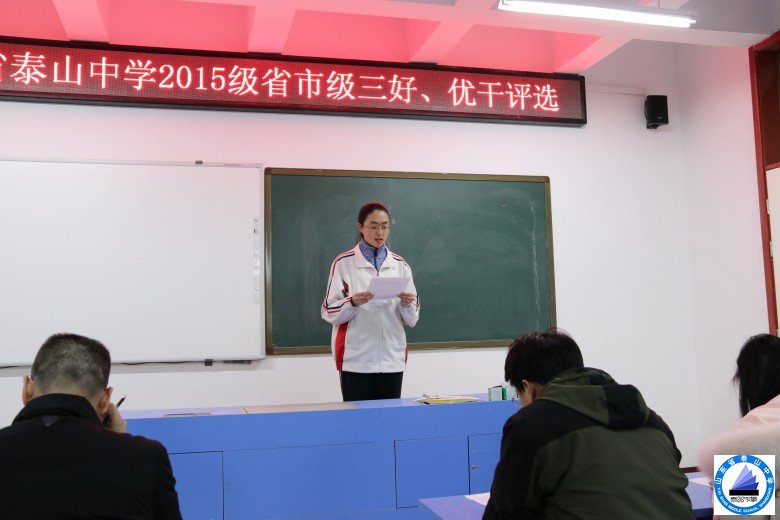 2017年12月27日下午4:30在东院教学楼五楼多媒体教室进行了2015级省市级三好、优干评选活动,活动由年级主任张刚主任主持,参与评选的评委有学校校长王诚胜,年级主任张波、安宪国、张刚,家长代表赵存鸿、陈静,班主任代表张俊、曹延民、王潇雨、许荷兰、李芳,教师代表蔡立刚、刘长坤,学生带表范华阳、吴乃凡。