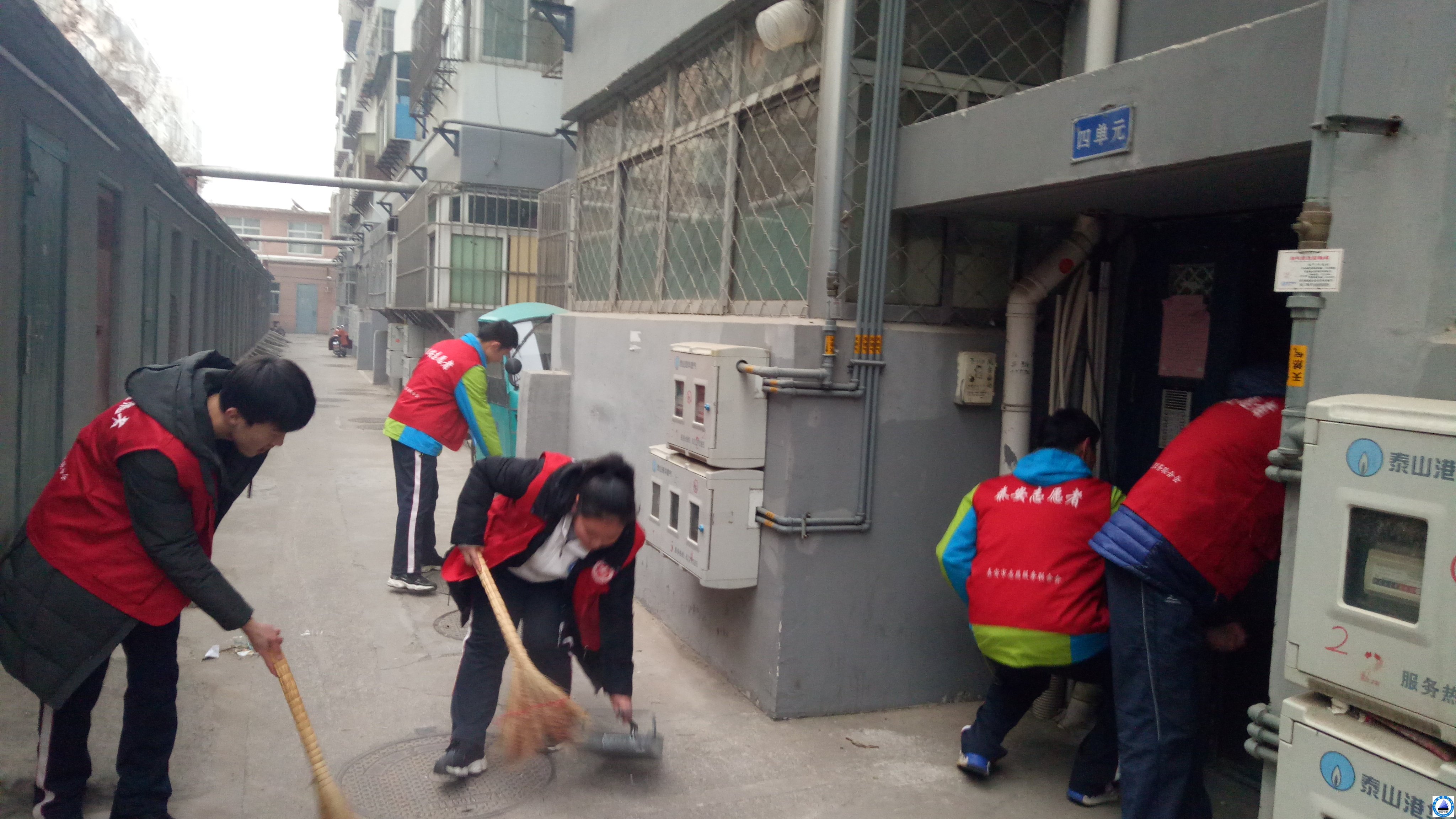 近日,泰山中学各年级学部按照学校团委关于志愿服务的号召,组织学生在文化路、泰中家属院等地进行志愿服务活动。春节将至,为营造良好的节日气氛,志愿者们带着卫生工具按小组分工在泰中家属院开展卫生保洁活动,部分同学拿着抹布擦干净了这四个楼道的楼梯和防盗门,同时也给老人们带去了温暖和问候。在文化路的志愿者们对道路两边乱放的自行车进行了排放,营造了文化路的良好的交通气氛,形为成了一道别样的风景线,