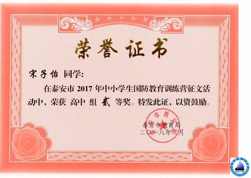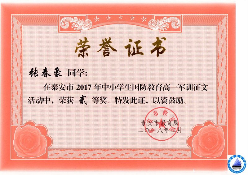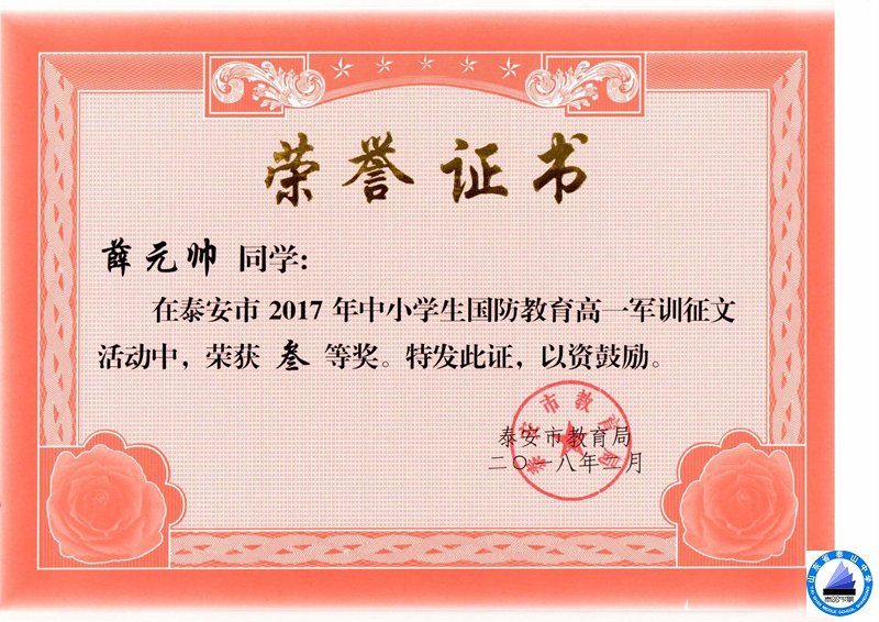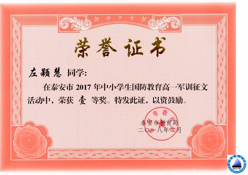 山东省泰山中学在全市2017年中小学生国防教育高一军训征文中喜获佳绩