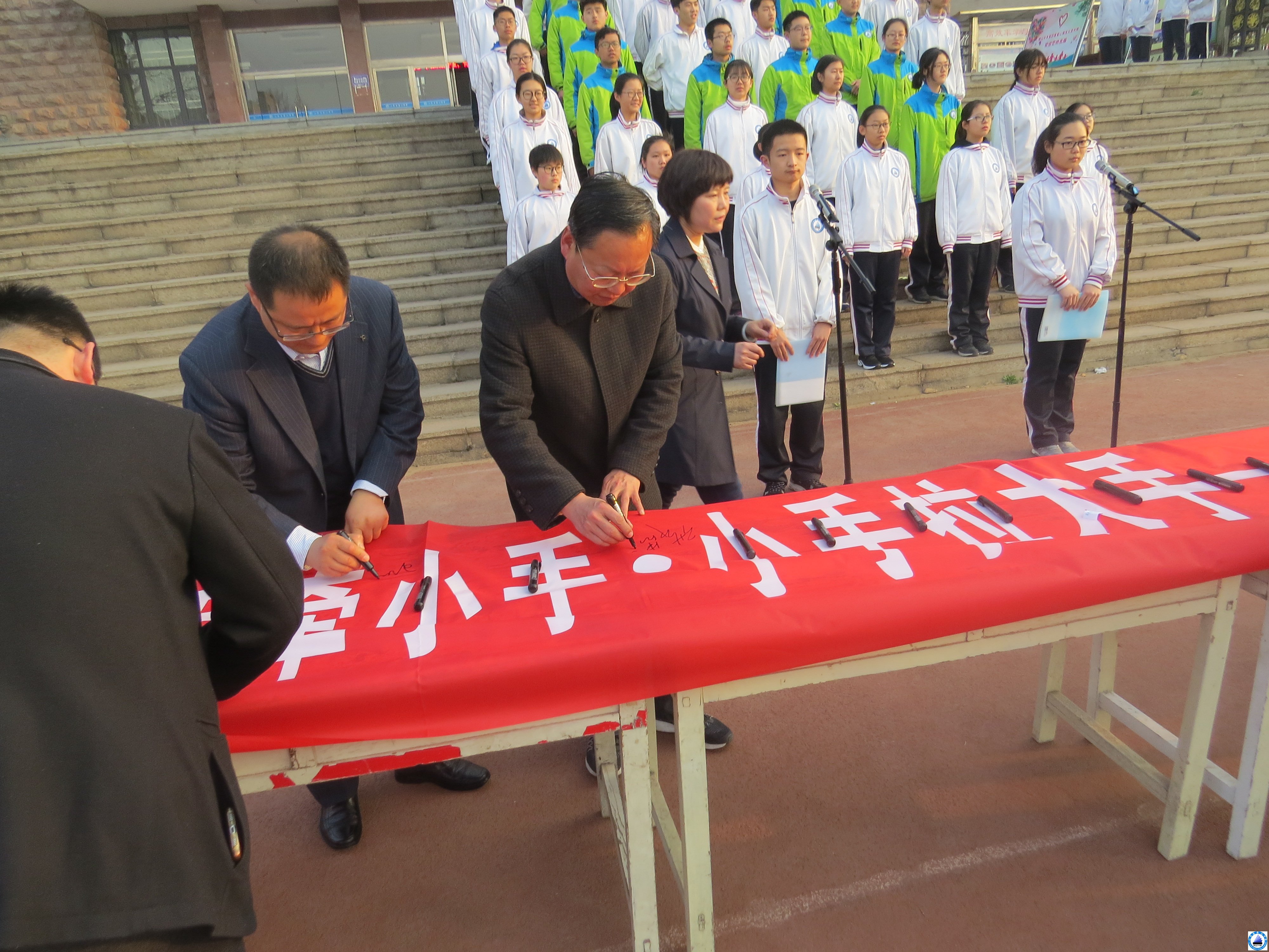 在活动启动仪式上,学生代表宣读了“大手牵小手·小手拉大手—学雷锋·文明劝导”志愿服务倡议书,号召广大师生从身边的小事做起,弘扬志愿精神,普及志愿理念,参与志愿服务,积极争做泰安市文明家园的参与者和守护者:崇德向善,做纯洁高尚的泰安人;注重素养,做文明有礼的泰安人;志愿奉献,做热心公益的泰安人,大手牵小手,小手拉大手,携手并肩,争做文明市民,争当志愿者,践行文明精神,共创文明城市,为美丽泰安增光添彩。