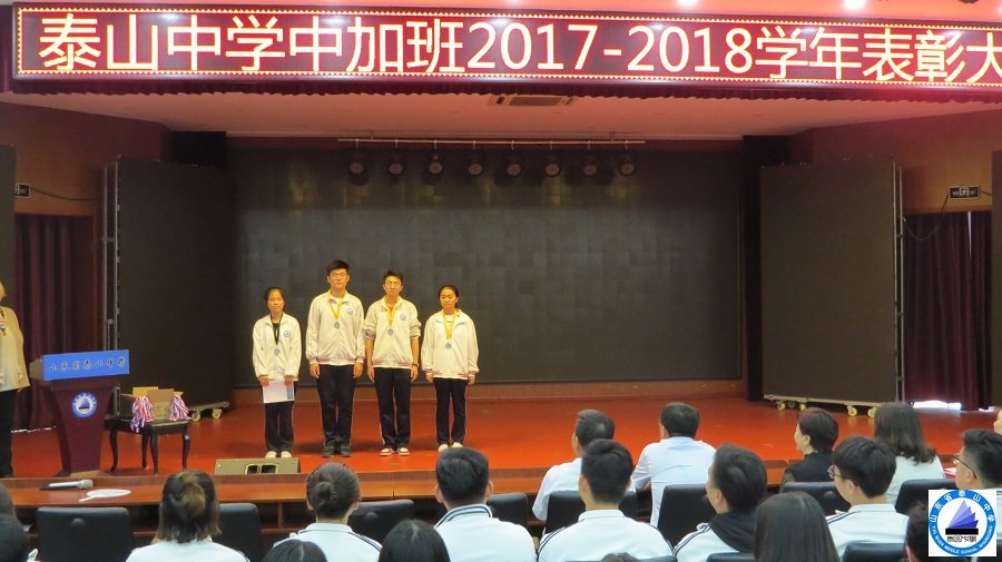 随后,马处长一行人参加了我校中加班2017-2018学年的表彰大会,表彰大会除了为在总体成绩、单科成绩、班级贡献、体育运动中取得较好成绩的学生颁奖外,还隆重表彰了在今年4月份的全球滑铁卢数学竞赛中取得优异成绩的同学,其中有四名同学取得了全球排名前25%的好成绩,并被授予了组委会颁发的奖牌和奖状。马处长为中加班学生们取得的优异成绩表示祝贺。