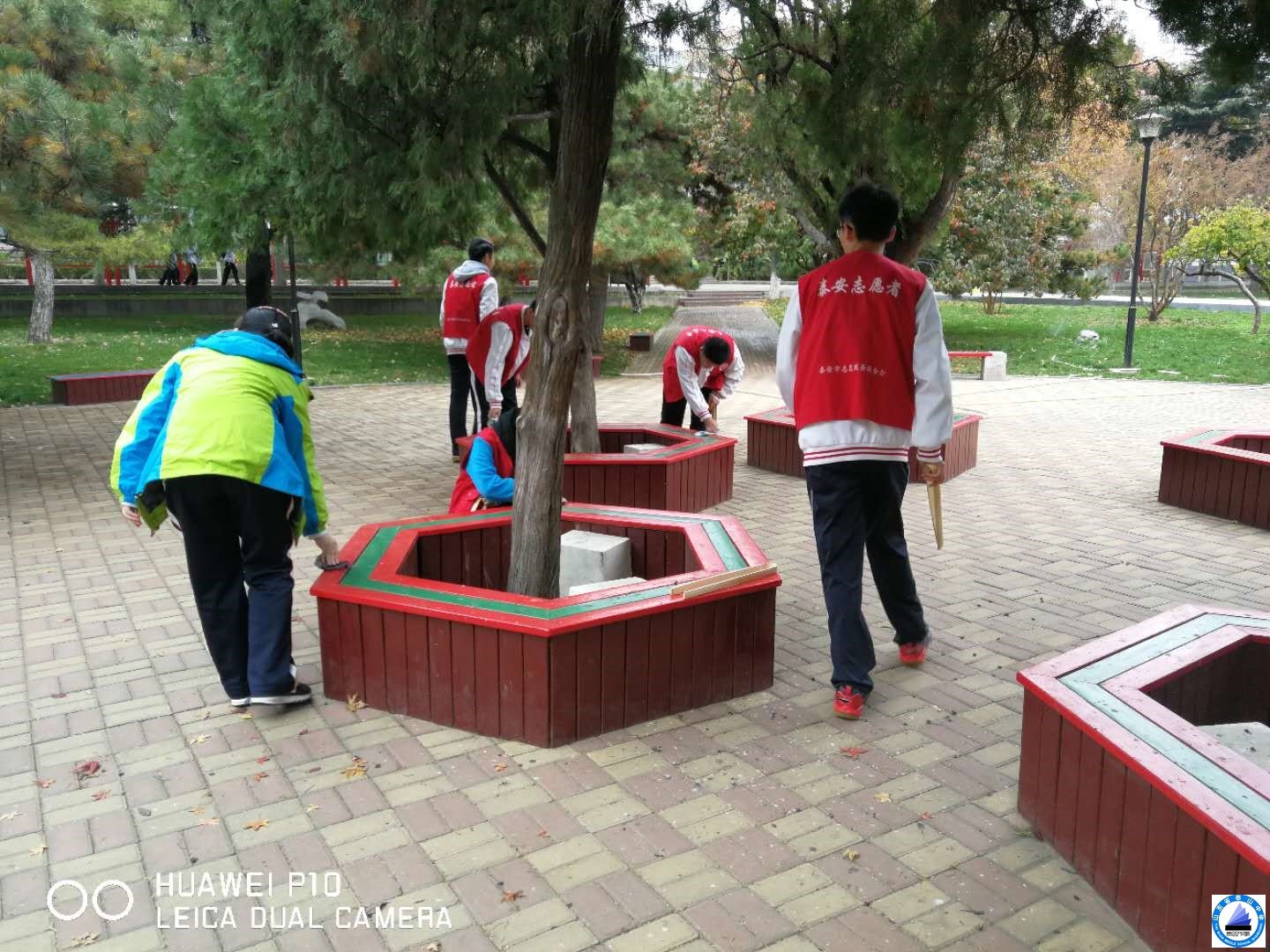 4.大家穿上统一的志愿者服装后前往小花园,一部分同学拿抹布擦长椅,另一部分同学扫地上的落叶和捡拾垃圾。