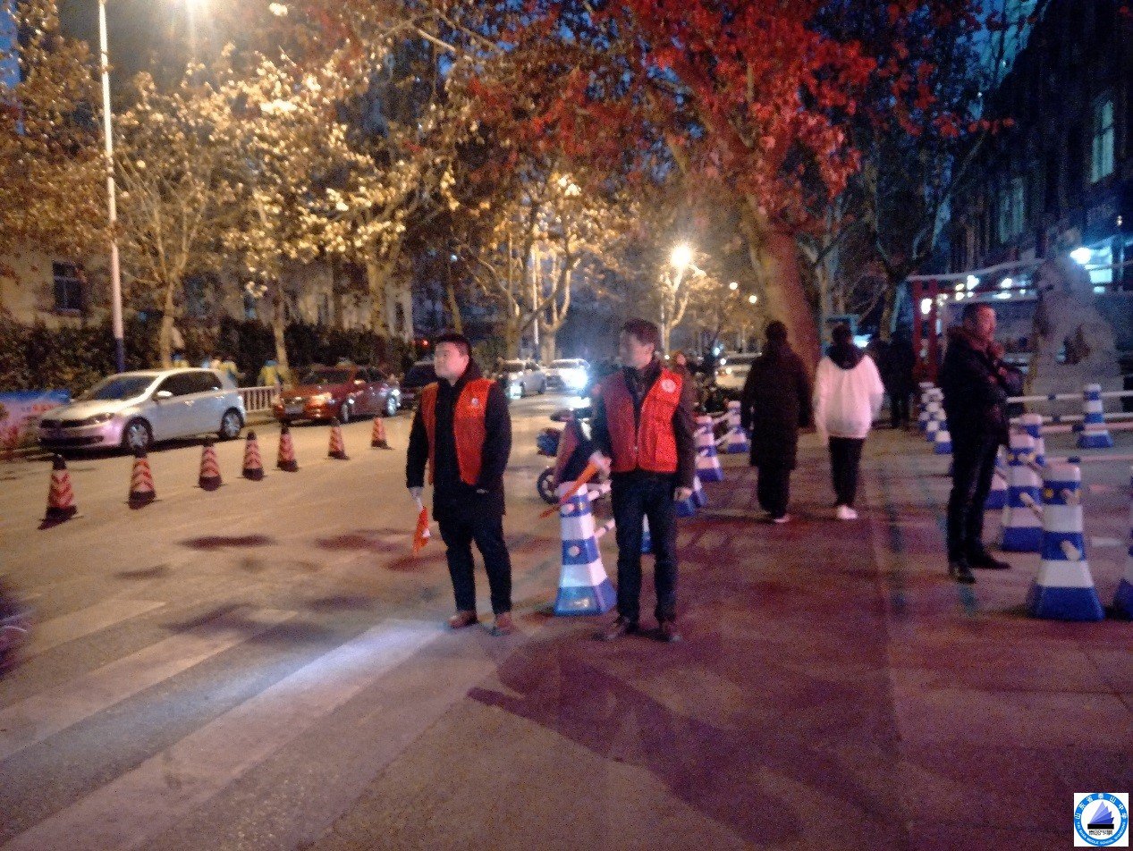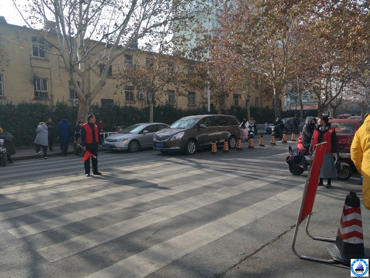 每天中午和下午放学期间,教师志愿者们身穿红色志愿者马甲、手持交通指引旗,在校门口、文化路路口维护交通秩序,提醒学生及过往行人遵守交通规则,不闯红灯、不乱穿马路、文明骑车。尽管天气寒冷,正值下班放学高峰期,车流量、人流量都比较大,但在教师志愿者协助下,学生能安全有序离校,校门口交通秩序井然有序。