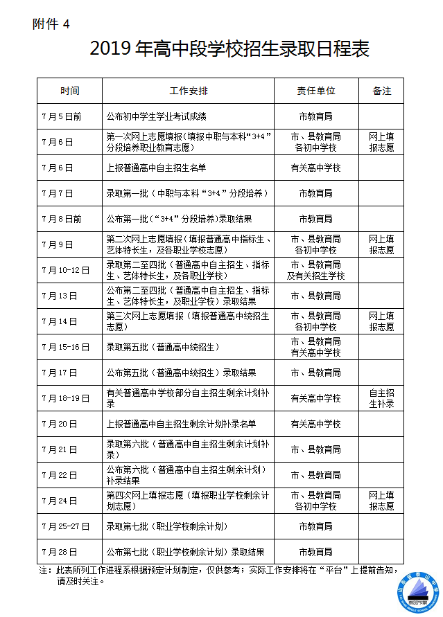 2019年高中段学校招生录取日程表