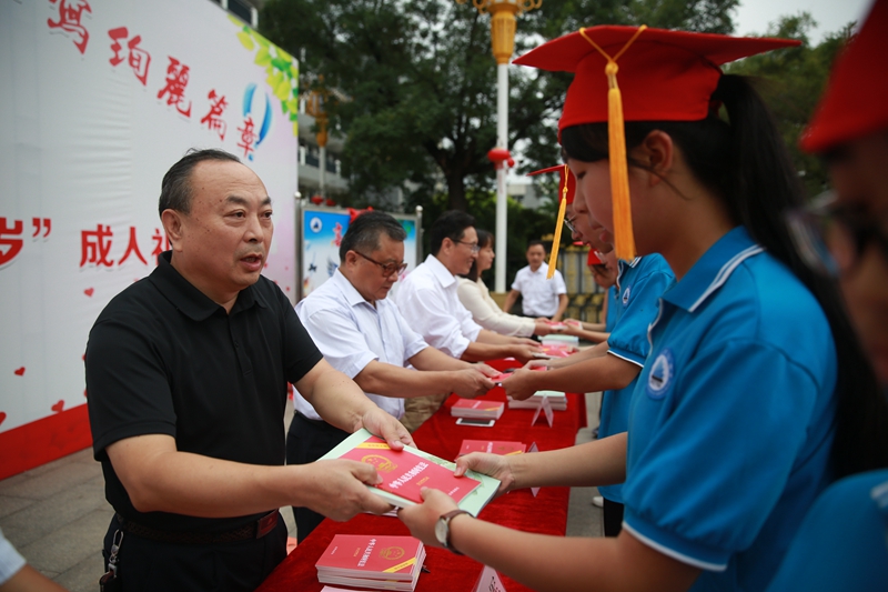 活动现场,学生与家长携手步入“成人门”,宣告学生们步入成人行列;举行了庄严神圣的“冠礼”仪式,家长为学生佩戴上成人帽,意味着学生们踏上了人生新的征程;同学们向家长恭行“拜谢礼”,感恩父母多年来的养育之恩;与会领导和师长向同学们赠送了《中华人民共和国宪法》等书籍,希望学生们明白成人的权利与义务,践行公民应有的责任与担当,做一个懂法守法的成年人。