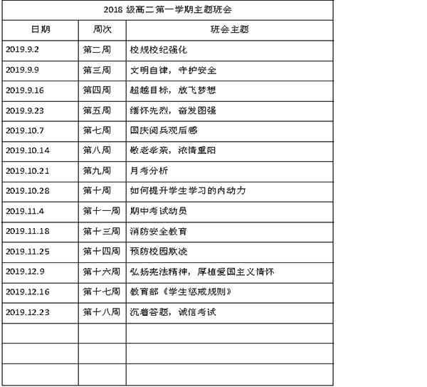 结合实际情况,除按照学工处统一要求开展的主题班会外, 各班开展《学习规章制度,树立规则意识》、《提升学生学习内动力》、《期中考试质量分析》等主题班会,规范年级主题班会的内容和要求,发挥班会在班级建设中主阵地的作用。