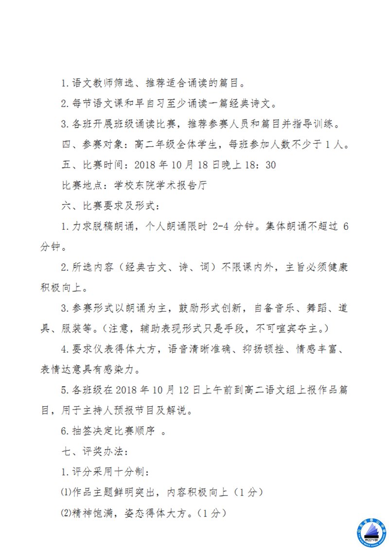 泰山中学开展高二年级“月圆中秋·和谐中华”经典诗文朗诵比赛活动方案