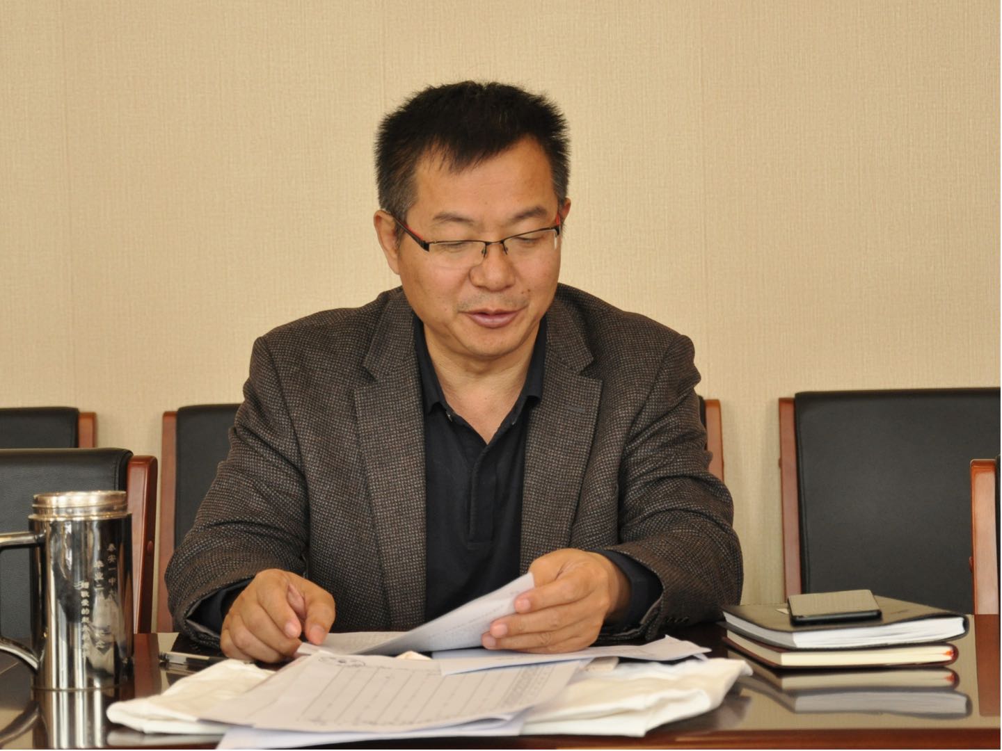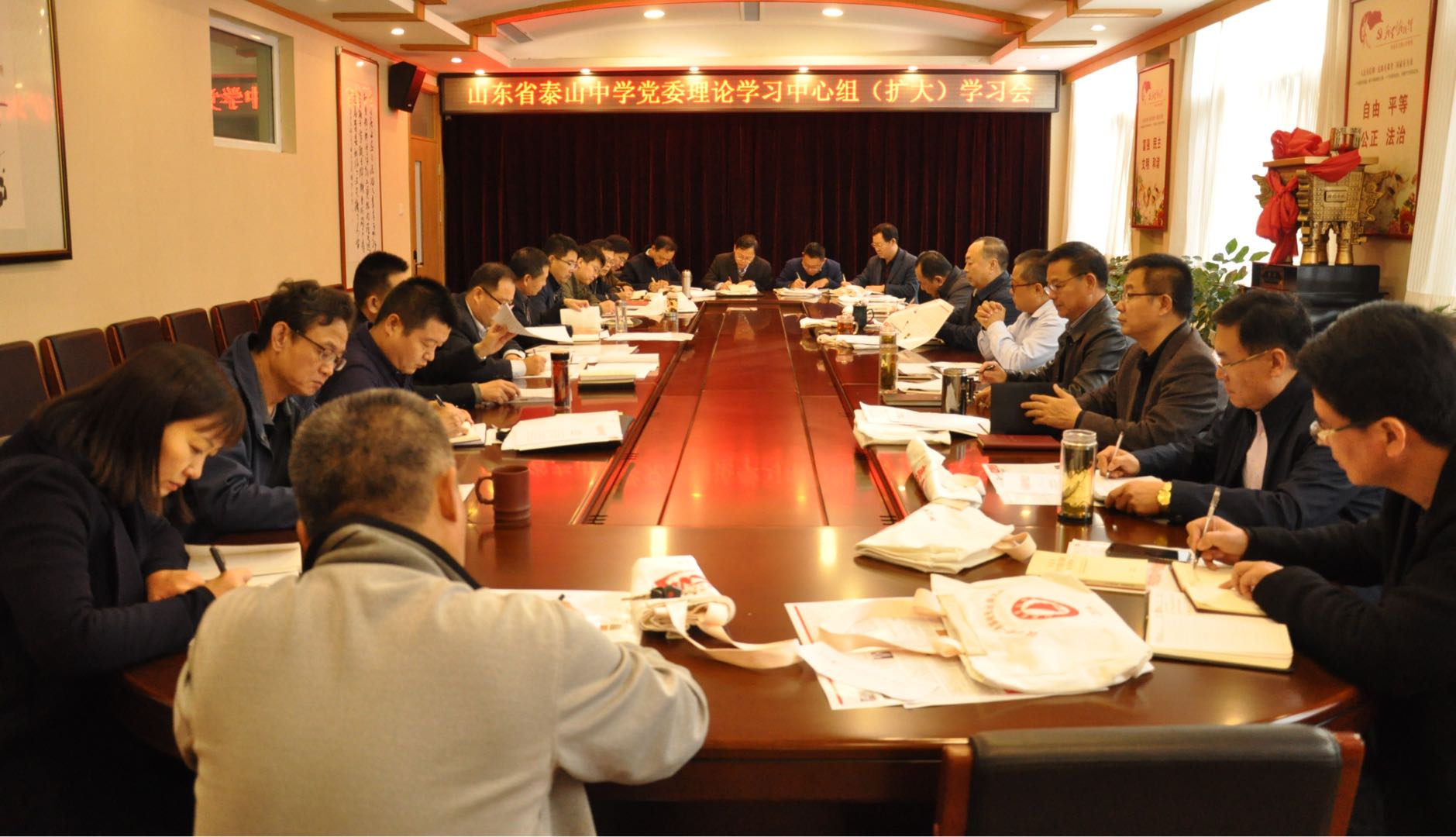 10月25日上午,山东泰山中学 “不忘初心、牢记使命”主题教育集中学习暨第三次专题研讨会在行知楼二楼会议室举行。校长周军,党委书记刘勇,党委副书记、副校长胡国保,副校长宋玉成,副校长赵永利出席会议。党委书记刘勇主持会议。